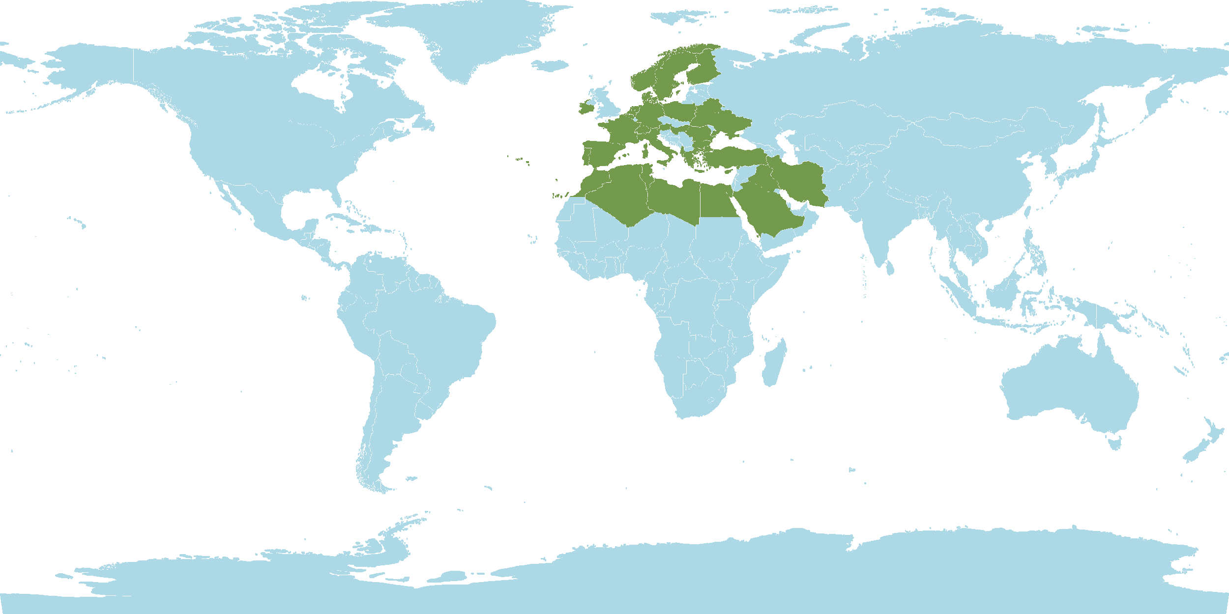 -  World Distribution : Albania, Algeria, Austria, Azores, Baleares, Baltic States, Belarus, Belgium, Bulgaria, Canary Islands, Central European Russia, Corse, Cyprus, Czechoslovakia, Denmark, East Aegean Islands, East European Russia, Egypt, Finland, France, Germany, Great Britain, Greece, Hungary, Iran, Iraq, Ireland, Italy, Kriti, Krym, Lebanon-Syria, Libya, Madeira, Morocco, Netherlands, North Caucasus, Northwest European Russia, Norway, Palestine, Poland, Portugal, Romania, Sardegna, Saudi Arabia, Sicilia, Sinai, South European Russia, Spain, Sweden, Switzerland, Transcaucasus, Tunisia, Turkey, Turkey-in-Europe, Ukraine, Yugoslavia