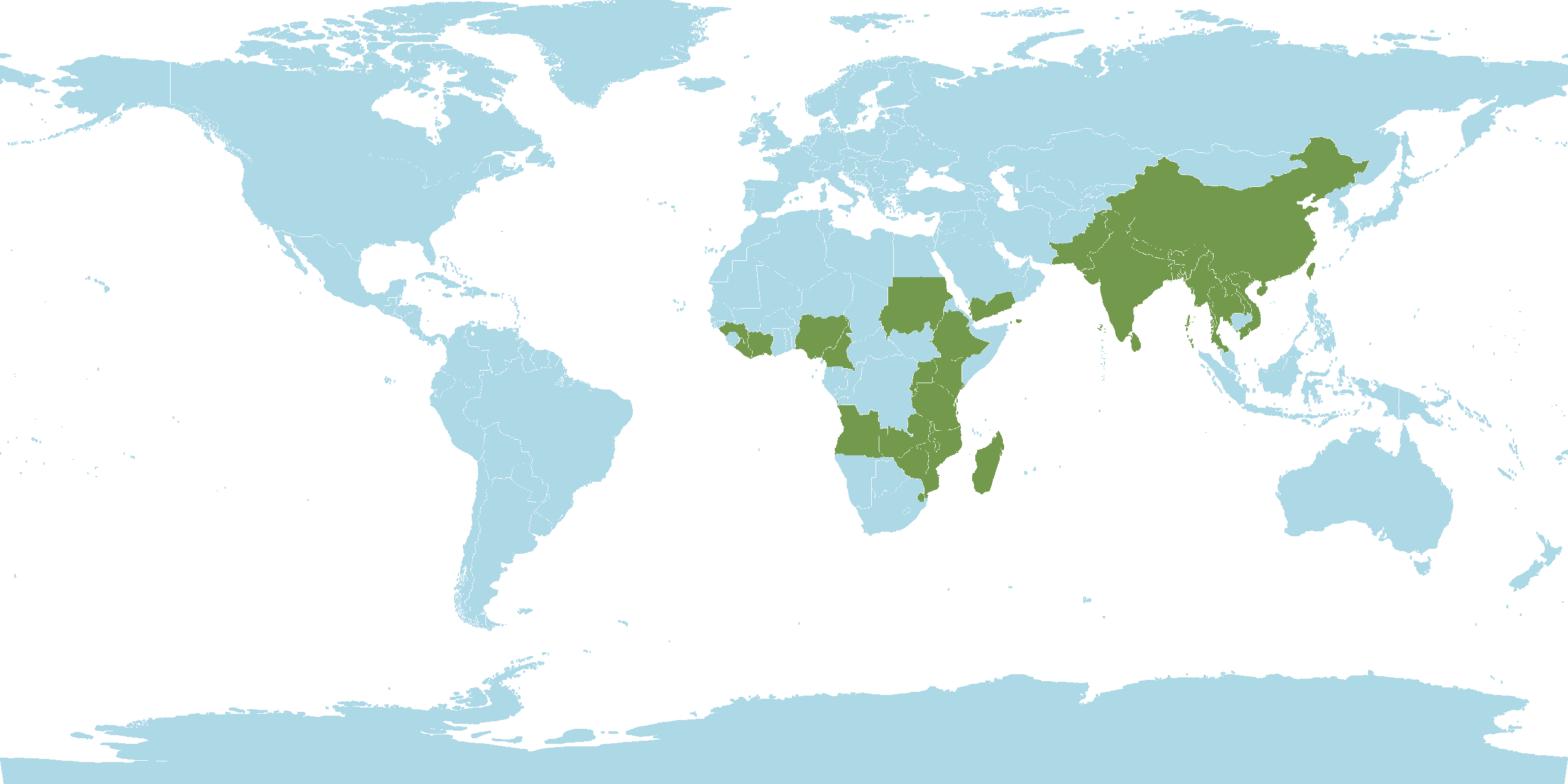 - World Distribution : Angola, Bangladesh, Bhutan, Burundi, Cameroon, China, Ethiopia, Guinea, India, Inner Mongolia, Ivory Coast, Jawa, Kenya, Korea, Laos, Lesser Sunda Islands, Liberia, Madagascar, Malawi, Manchuria, Mozambique, Myanmar, Nepal, Nigeria, Northern Provinces, Pakistan, Primorye, Rwanda, Sri Lanka, Sudan, Sulawesi, Sumatera, Swaziland, Taiwan, Tanzania, Thailand, Tibet, Uganda, Vietnam, Yemen, Zambia, Zaïre, Zimbabwe