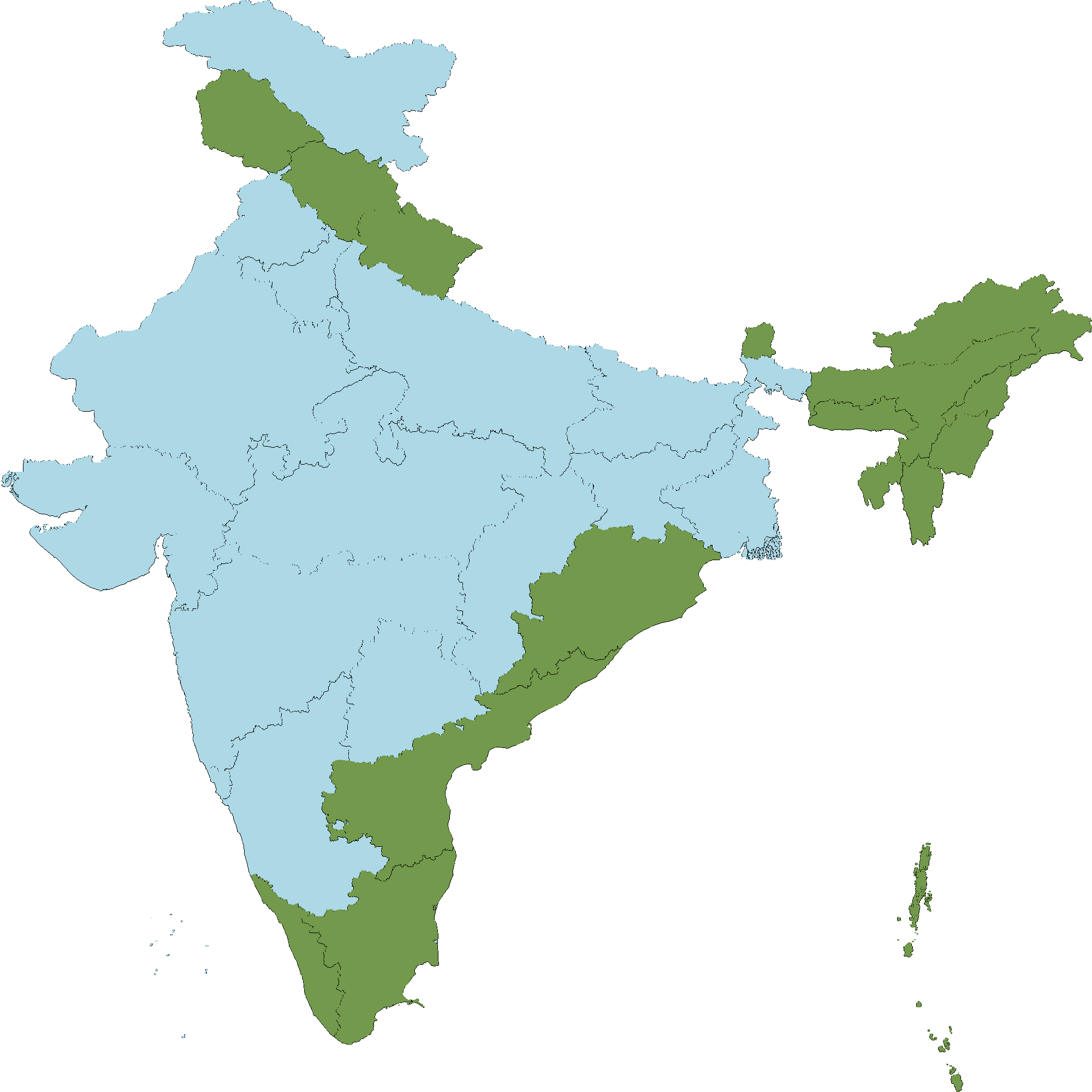 - Kerala : Kasaragod district, Wayanad district, Kozhikode district, Malappuram district, Palakkad district, Thrissur district, Idukki district, Kottayam district, Alappuzha district, Pathanamthitta district, Kollam district, Thiruvananthapuram district