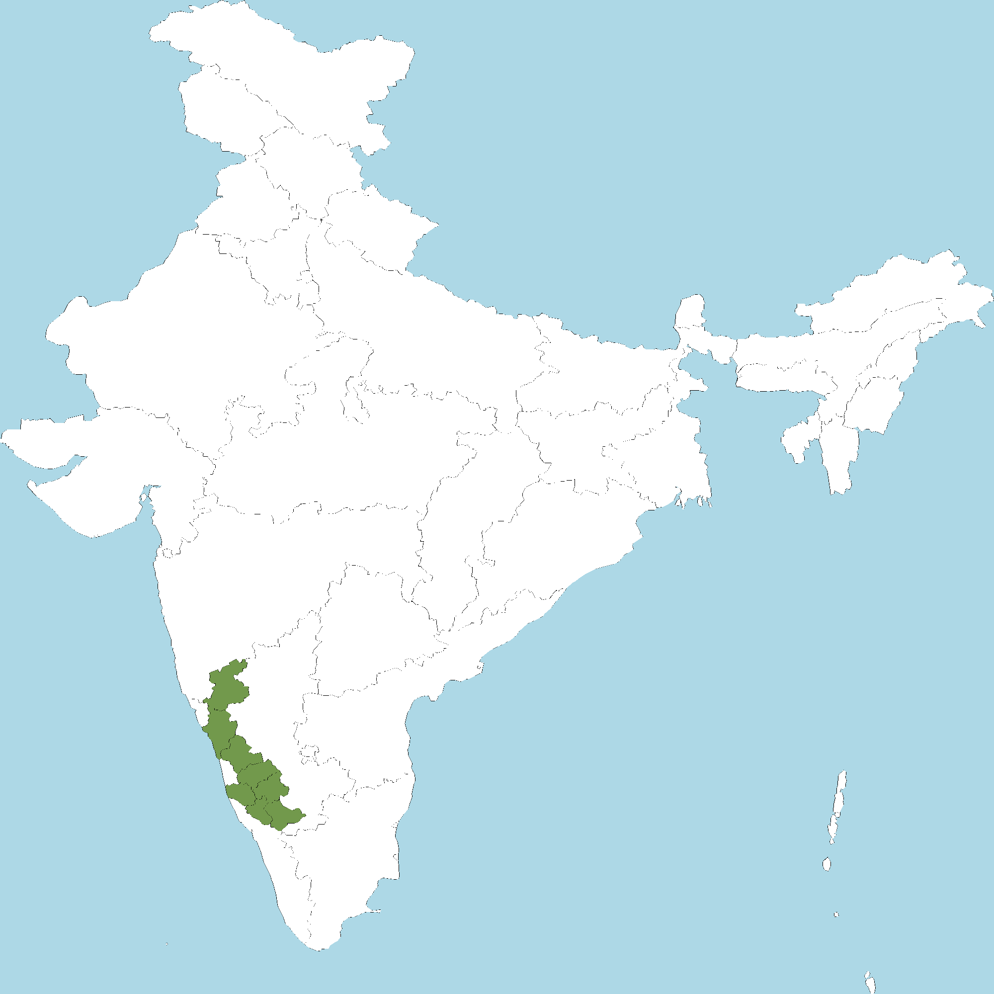 • Karnataka : Belagavi district, Chikkamagaluru district, Dakshina Kannada district, Hassan district, Kodagu (Coorg) district, Mysuru district, Shivamogga district, Uttara Kannada district