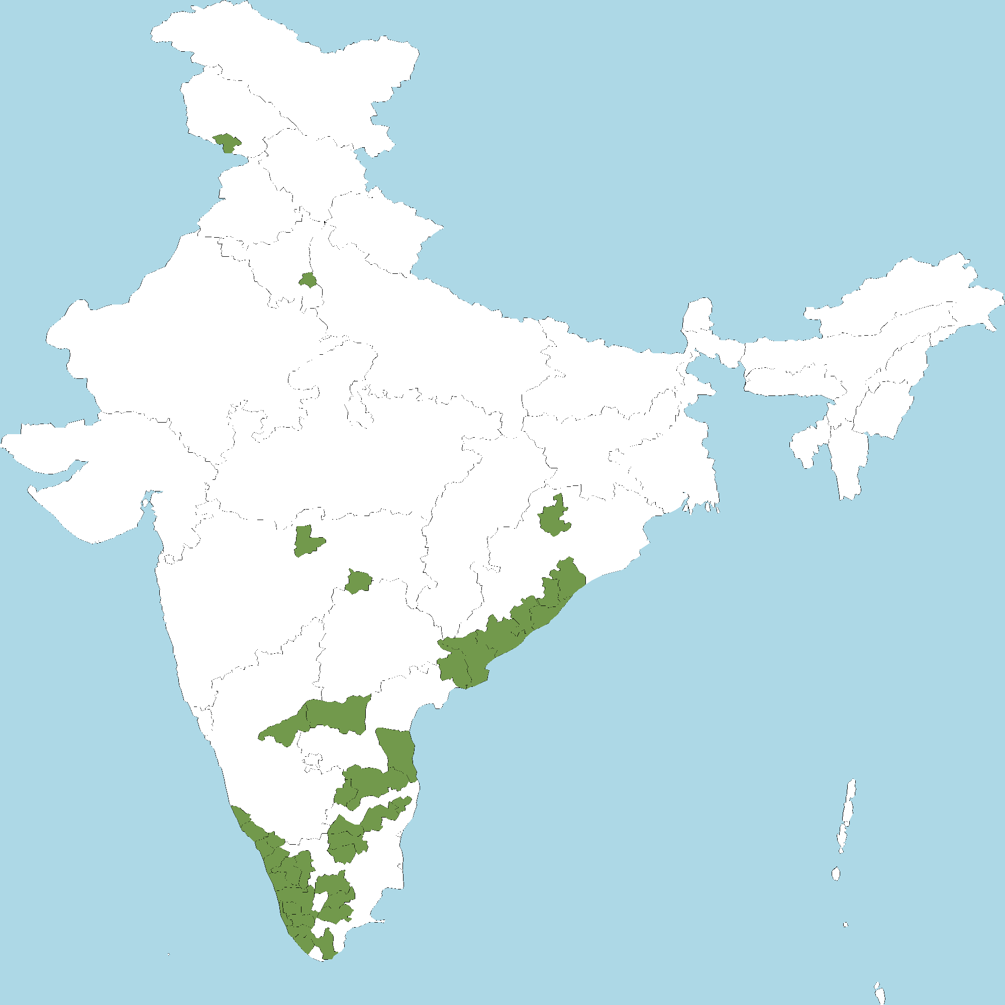 - Tamil Nadu : Coimbatore district, Dharmapuri district, Dindigul district, Kancheepuram (Changalpattu-CGP) district, Madurai district, Namakkal district, The Nilgiri district, Salem district, Tirunelveli district, Tiruchirapalli district, Tiruvannamalai district, Virudhunagar district