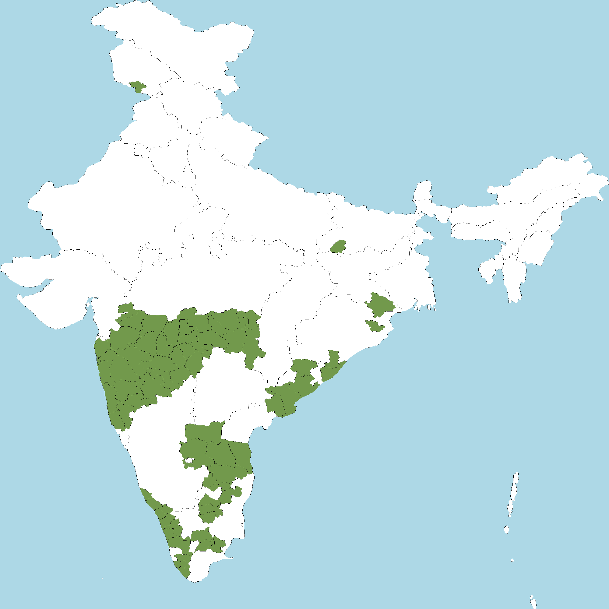- Kerala : Kasaragod district, Kannur district, Wayanad district, Kozhikode district, Malappuram district, Palakkad district, Thrissur district, Ernakulam district, Idukki district, Pathanamthitta district, Kollam district, Thiruvananthapuram district