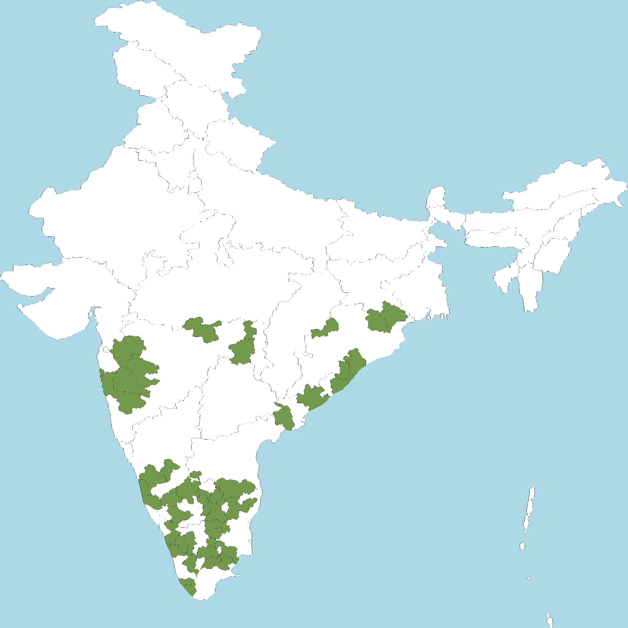 - Kerala : Wayanad district, Malappuram district, Palakkad district, Thrissur district, Idukki district, Kollam district, Thiruvananthapuram district