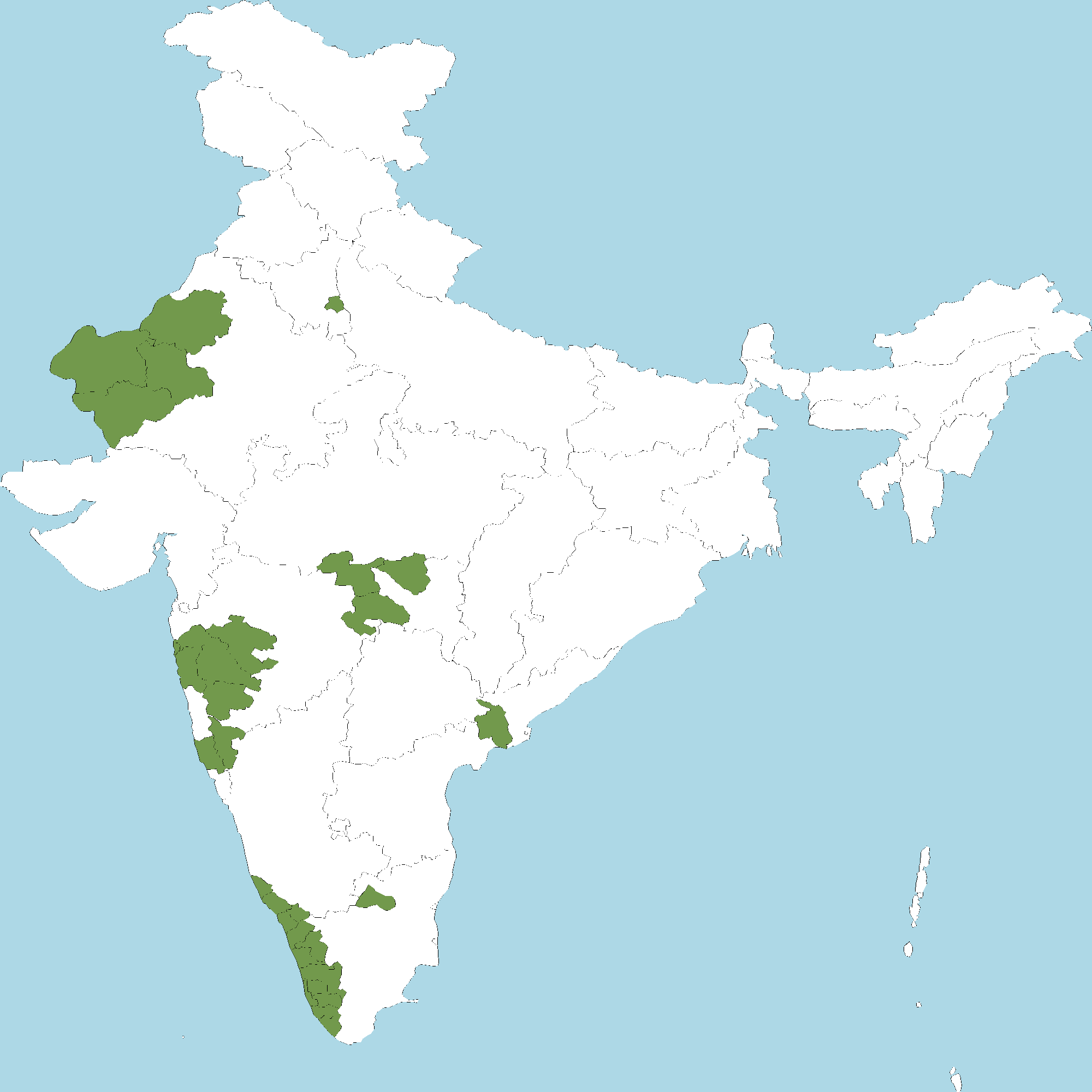 - Maharashtra : Ahmednagar district, Amravati district, Mumbai Suburban district, Kolhapur district, Nagpur district, Pune district, Raigad district, Satara district, Sindhudurg district, Thane district, Yavatmal district
