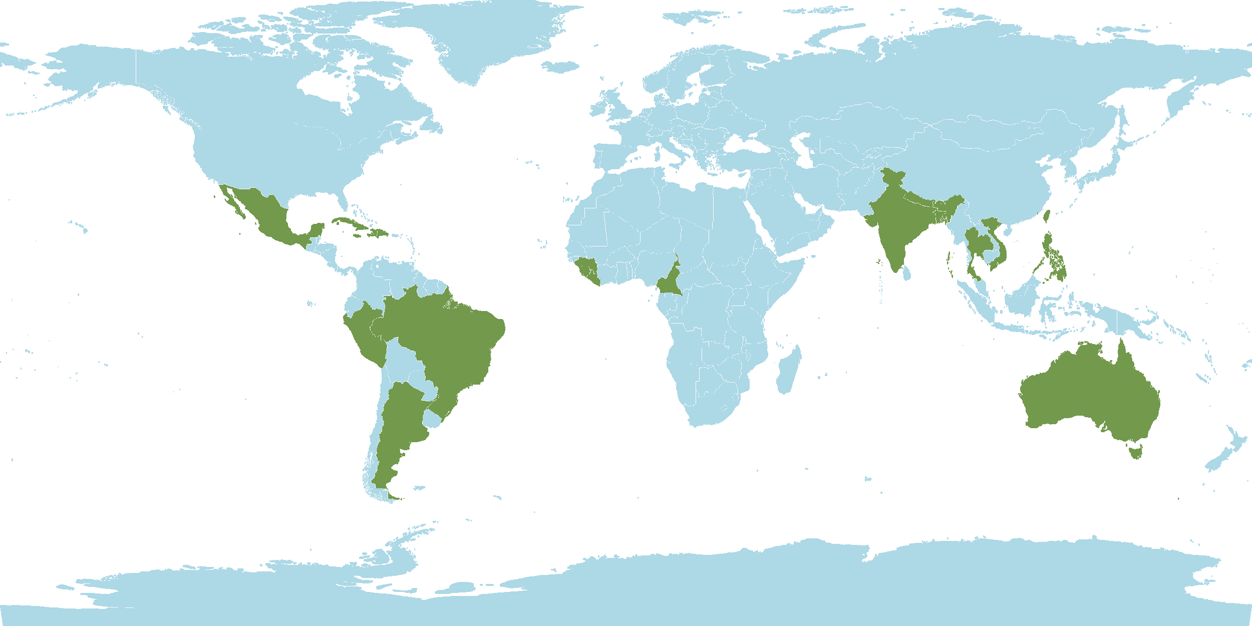 - Native : Argentina, Australia, Bangladesh, Bhutan, Brazil, Cameroon, Cuba, Dominican Republic, Guinea, Gulf of Guinea Islands, Haiti, India, Jamaica, Jawa, Leeward Islands, Liberia, Malaya, Mexico, Nansei-shoto, Nepal, New Guinea, Peru, Philippines, Puerto Rico, S