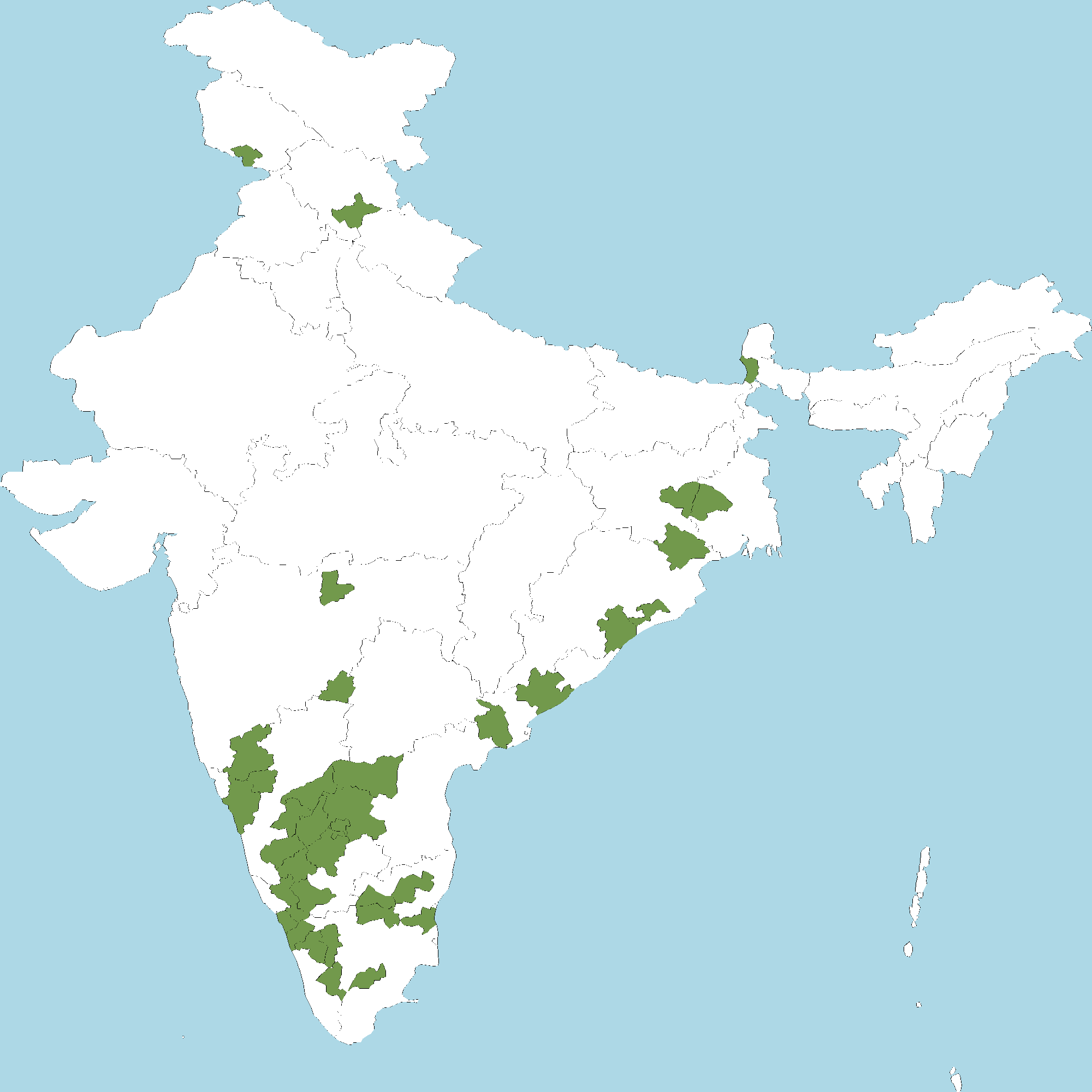 - Karnataka : Belagavi district, Ballari district, Bidar district, Chikkamagaluru district, Chitradurga district, Davanagere district, Dharwad district, Hassan district, Kodagu (Coorg) district, Mysuru district, Tumakuru district, Uttara Kannada district