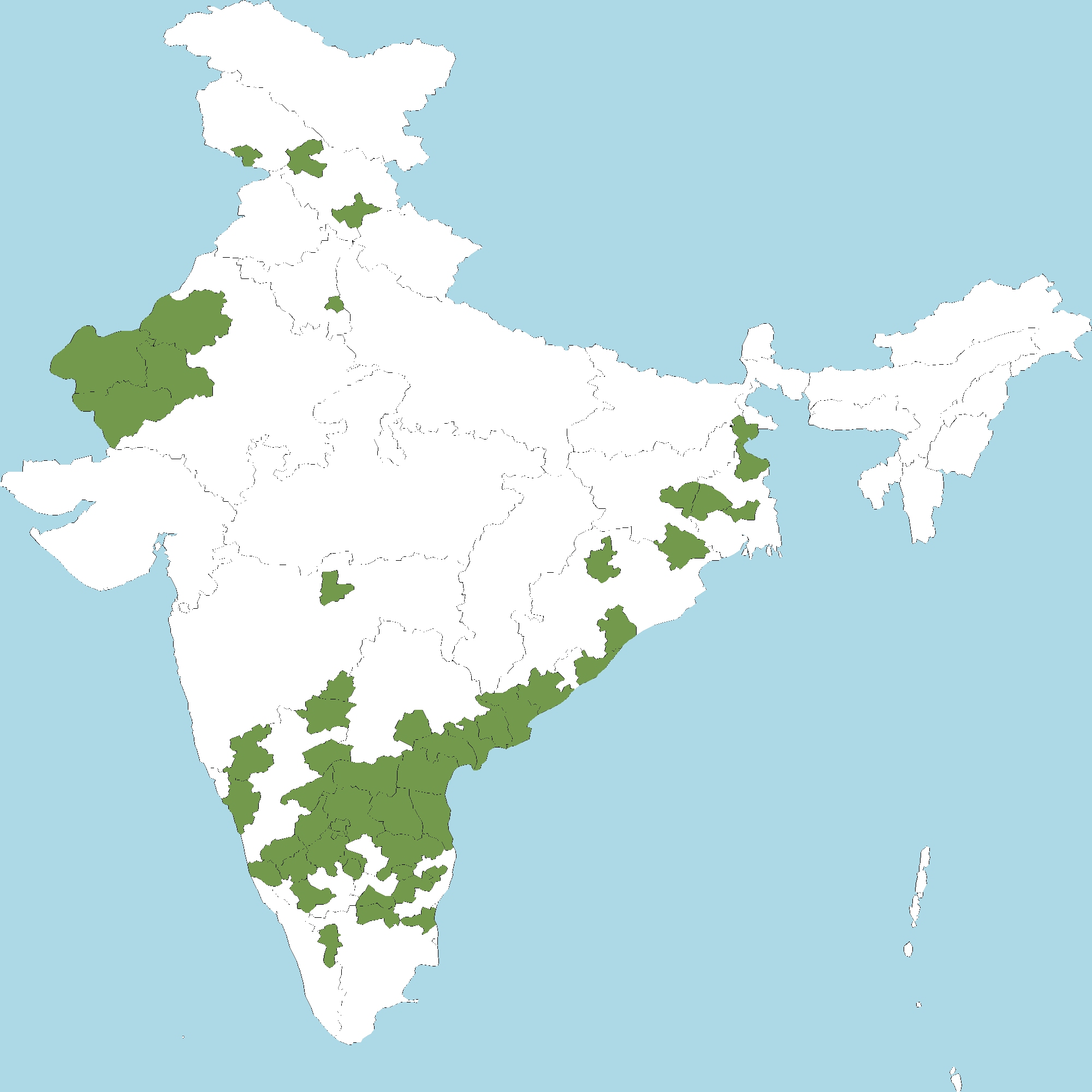 - Andhra Pradesh : Anantapur district, Kurnool district, S.P.S. Nellore district, Y.S.R. Kadapa district, Visakhapatnam district, East Godavari district, Srikakulam district, West Godavari district, Guntur district, Prakasam district, Y.S.R. Kadapa district, Chittoor district, Krishna district