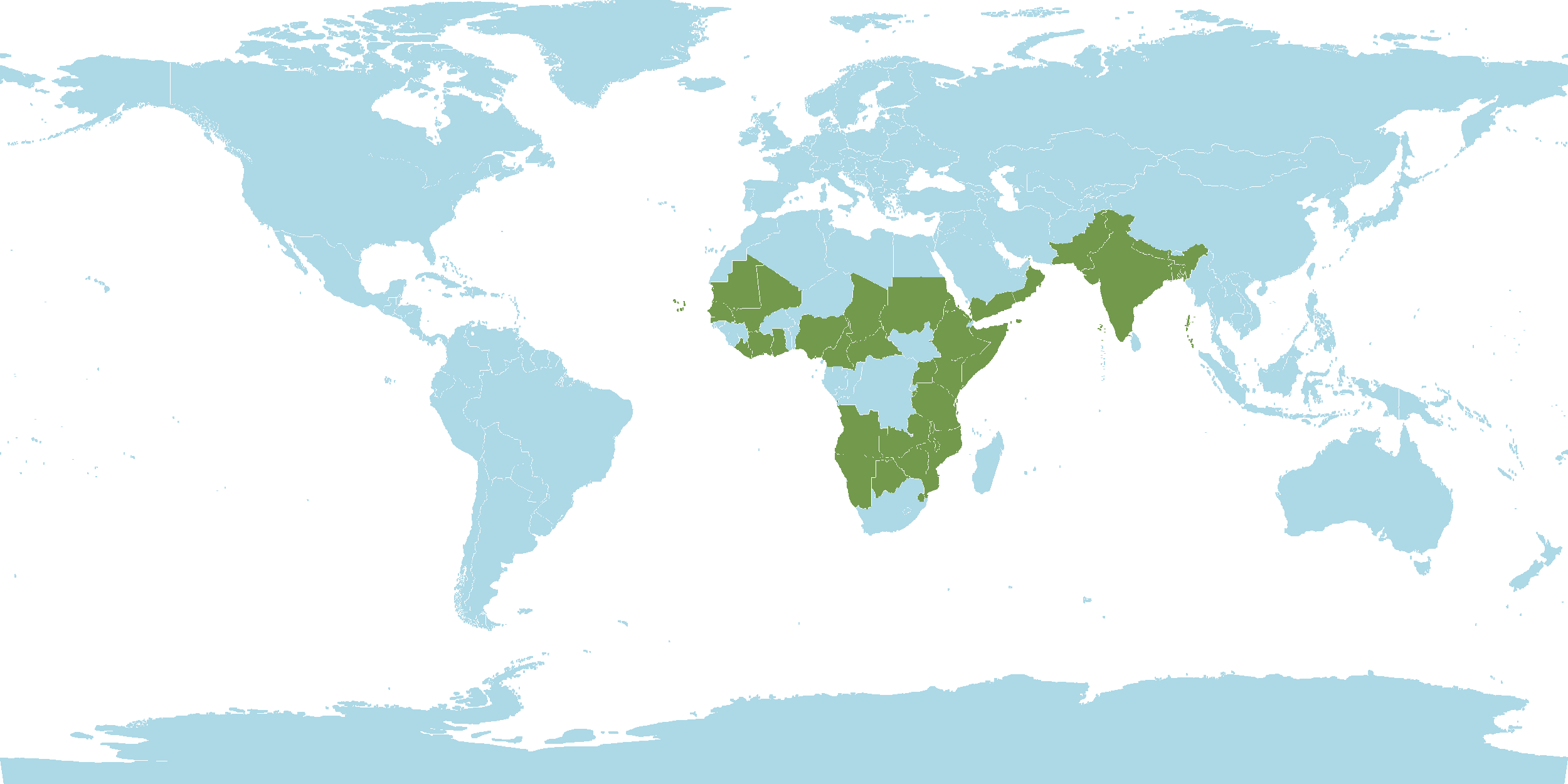 - World Distribution : Angola, Bangladesh, Botswana, Burundi, Cameroon, Cape Verde, Central African Republic, Chad, Eritrea, Ethiopia, Gambia, Ghana, India, Ivory Coast, Kenya, Liberia, Malawi, Mali, Mauritania, Mozambique, Namibia, Nepal, Nigeria, Northern Provinces, Oman, Pakistan, Senegal, Somalia, Sudan, Swaziland, Tanzania, Uganda, Yemen, Zambia, Zaïre, Zimbabwe