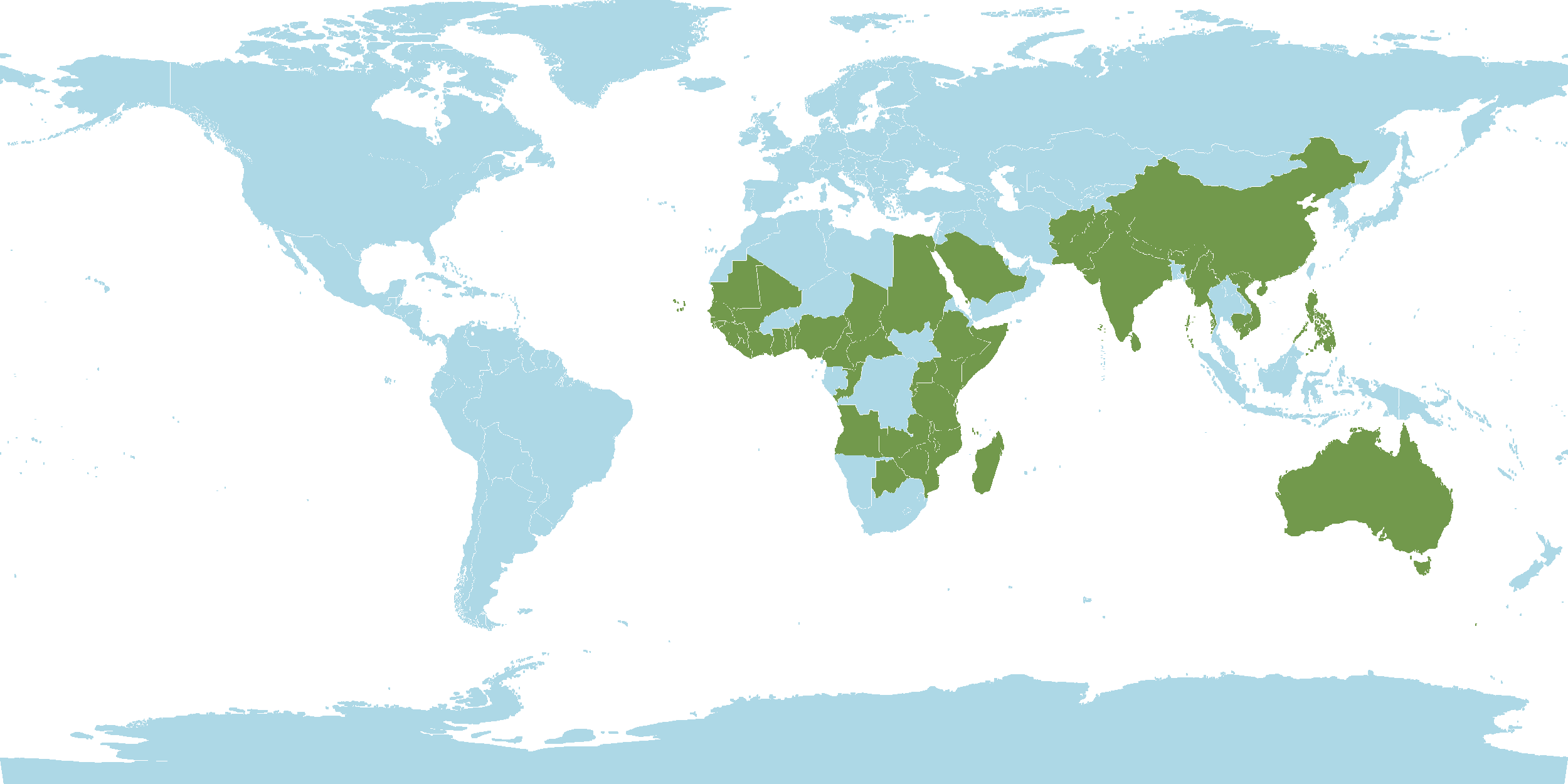 - World Distribution : Afghanistan, Angola, Australia, Benin, Bhutan, Botswana, Burkina, Burundi, Cambodia, Cameroon, Cape Verde, Central African Republic, Chad, China, Comoros, Congo, Egypt, Ethiopia, Gambia, Ghana, Guinea, Guinea-Bissau, Gulf of Guinea Islands, India, Ivory Coast, Jawa, Kenya, Lesser Sunda Islands, Liberia, Madagascar, Malawi, Malaya, Mali, Mauritania, Mozambique, Myanmar, Nepal, New Guinea, Nigeria, Northern Provinces, Pakistan, Philippines, Rwanda, Saudi Arabia, Senegal, Sierra Leone, Somalia, Sri Lanka, Sudan, Sulawesi, Sumatera, Tadzhikistan, Tanzania, Togo, Uganda, Vietnam, Zambia, Zaïre, Zimbabwe