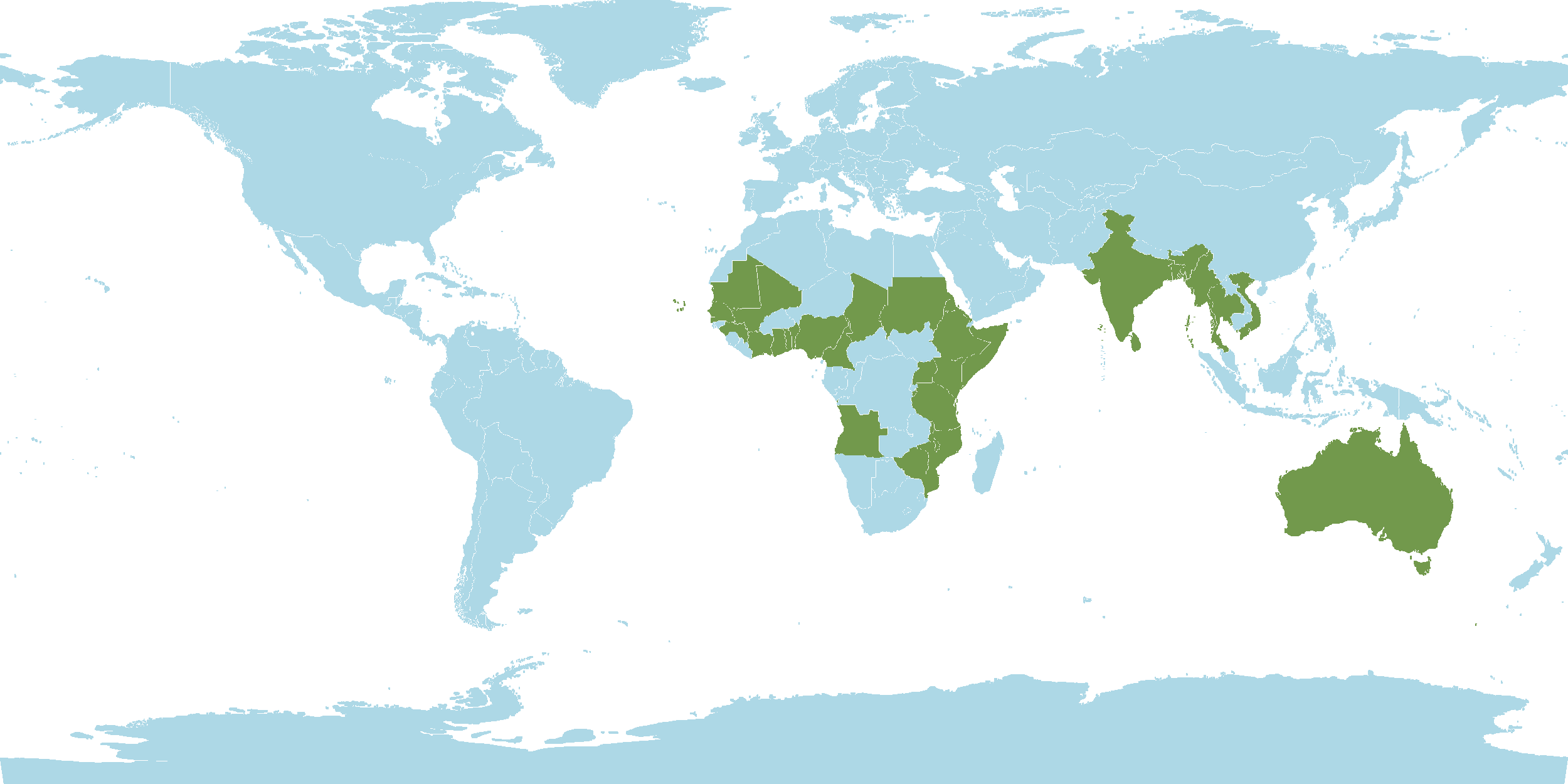 - World Distribution : Angola, Australia, Bangladesh, Benin, Burkina, Burundi, Cameroon, Cape Verde, Central African Repu, Chad, Eritrea, Ethiopia, Gambia, Ghana, Guinea, Hainan, India, Ivory Coast, Jawa, Kenya, Lesser Sunda Islands, Malawi, Malaya, Mali, Mauritania, Mozambique, Myanmar, New Guinea, Nigeria, Senegal, Somalia, Sri Lanka, Sudan, Sulawesi, Tanzania, Thailand, Togo, Uganda, Vietnam, Zaïre, Zimbabwe