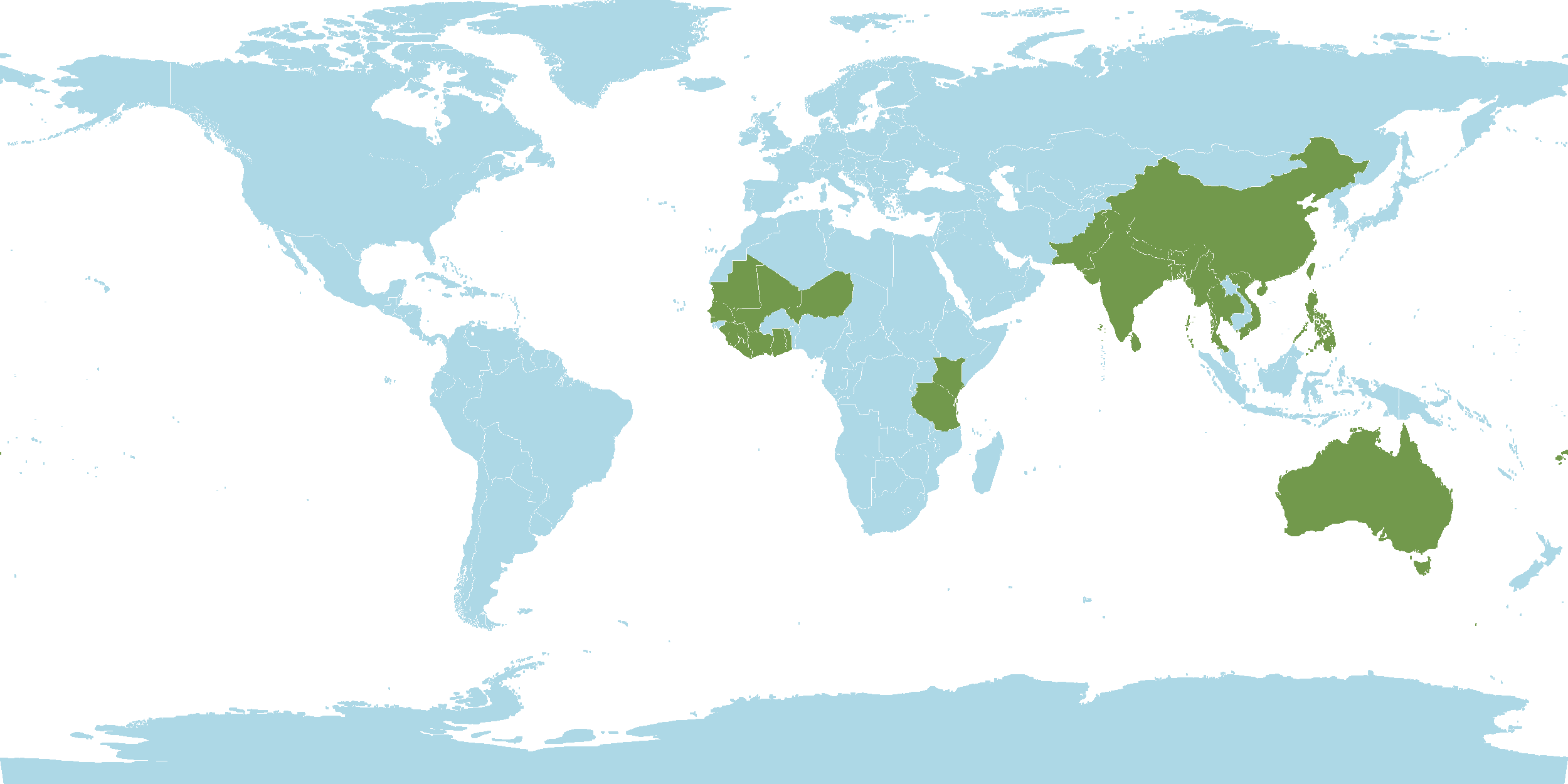 - World Distribution : Andaman and Nicobar Islands, Australia, Bangladesh, Bhutan, Borneo, Burkina, Caroline Islands, China, Fiji, Gambia, Ghana, Guinea, Hainan, India, Ivory Coast, Jawa, Kenya, Lesser Sunda Islands, Liberia, Malaya, Mali, Marianas, Mauritania, Myanmar, Nansei-shoto, Nepal, Niger, Pakistan, Philippines, Senegal, Sierra Leone, Sri Lanka, Sumatera, Taiwan, Tanzania, Thailand, Togo, Vietnam