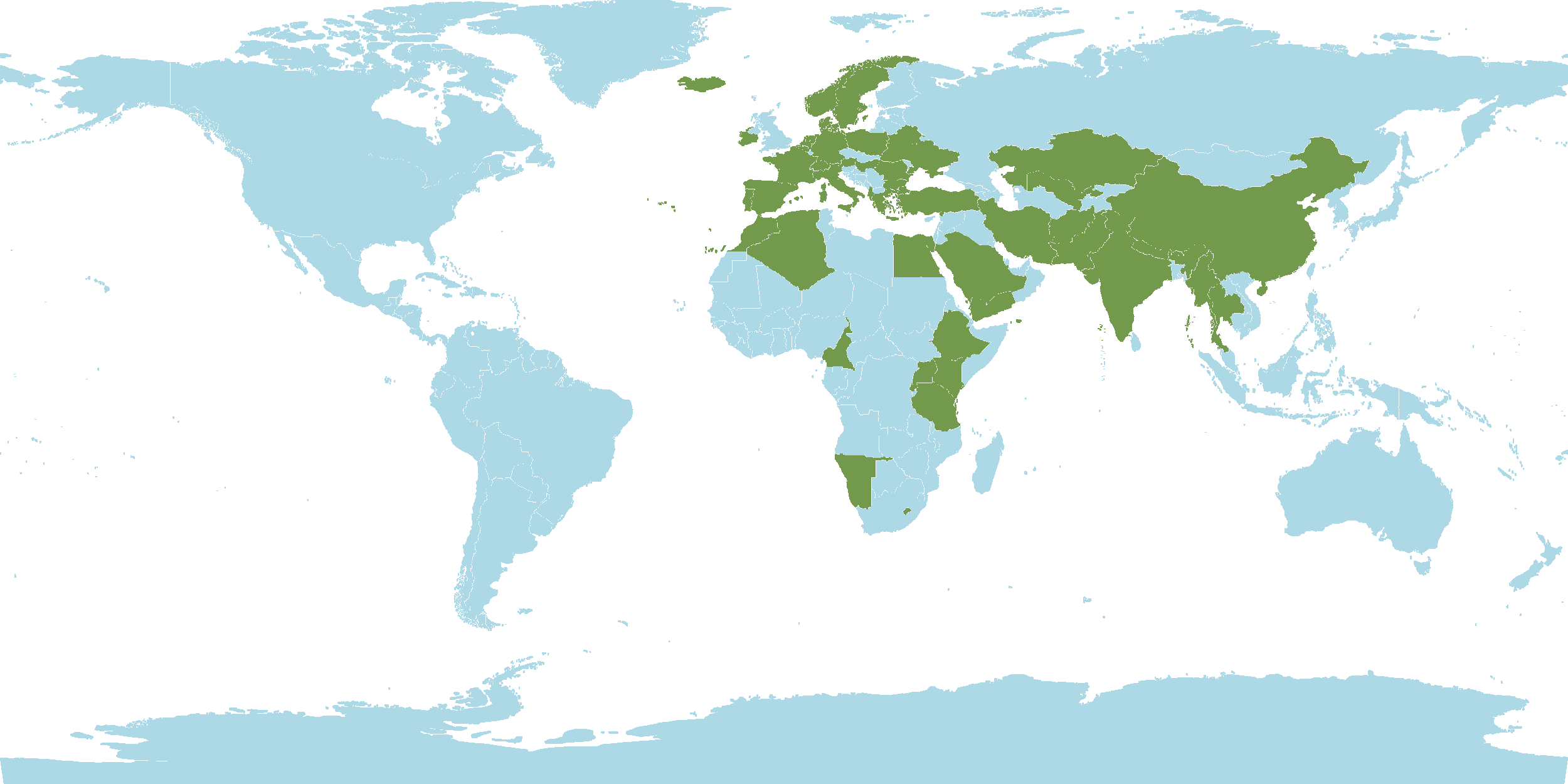 - World Distribution : Afghanistan, Albania, Algeria, Austria, Azores, Baltic States, Belarus, Belgium, Bhutan, Bulgaria, Cameroon, Cape Provinces, Central European Rus, China, Corse, Czechoslovakia, Denmark, East European Russia, Egypt, Ethiopia, France, Free State, Føroyar, Germany, Great Britain, Greece, Gulf of Guinea Islands, Hungary, Iceland, India, Inner Mongolia, Iran, Ireland, Italy, Kazakhstan, Kenya, Kirgizstan, KwaZulu-Natal, Lebanon-Syria, Lesotho, Madeira, Morocco, Myanmar, Namibia, Nepal, Netherlands, North Caucasus, Northern Provinces, Northwest European R, Norway, Pakistan, Poland, Portugal, Qinghai, Romania, Rwanda, Saudi Arabia, Sicilia, South European Russi, Spain, Sweden, Switzerland, Tadzhikistan, Tanzania, Thailand, Tibet, Transcaucasus, Turkey, Uganda, Ukraine, Uzbekistan, Xinjiang, Yemen, Yugoslavia, Zaïre