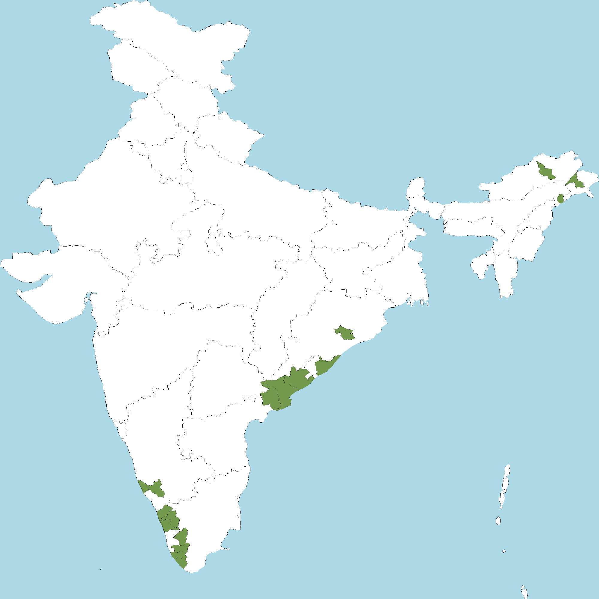 - Kerala : Kasaragod district, Malappuram district, Palakkad district, Thrissur district, Idukki district, Pathanamthitta district, Kollam district, Thiruvananthapuram district