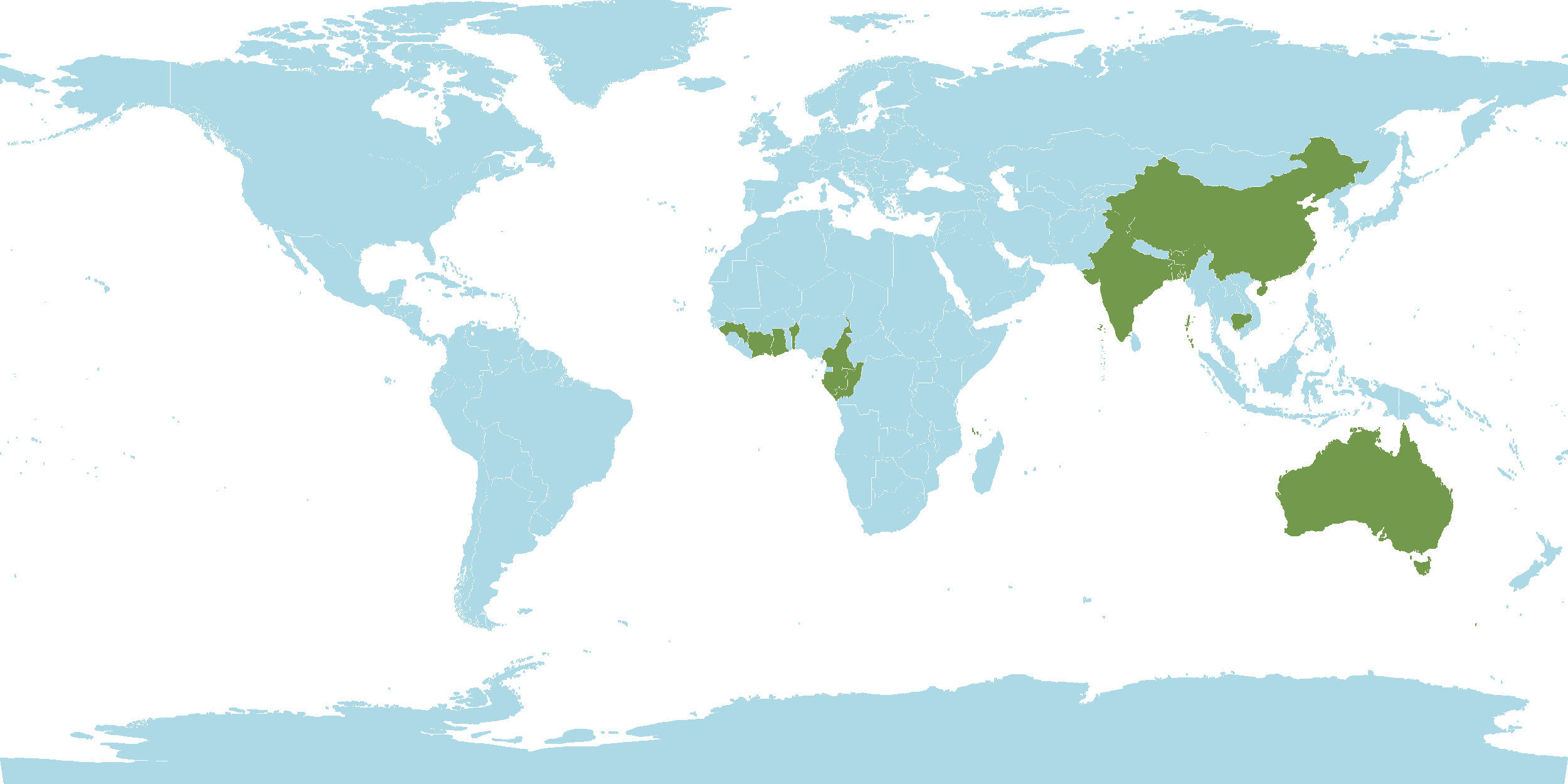- Native : Australia, Bangladesh, Benin, Bhutan, Bismarck Archipelago, Borneo, Cambodia, Cameroon, Caroline Islands, Central African Repu, China, Comoros, Congo, Cook Islands, Gabon, Ghana, Gilbert Islands, Guinea, Gulf of Guinea Islands, Hainan, India, Ivory Coast,
