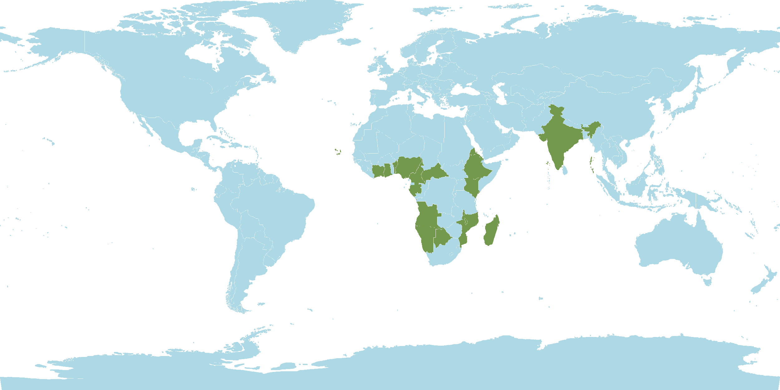 - Native : Angola, Benin, Botswana, Cameroon, Cape Provinces, Cape Verde, Central African Republic, Eritrea, Ethiopia, Free State, Gabon, Gambia, Ghana, India, Ivory Coast, Kenya, KwaZulu-Natal, Madagascar, Malawi, Mozambique, Namibia, Nigeria, Northern Provinces, R
