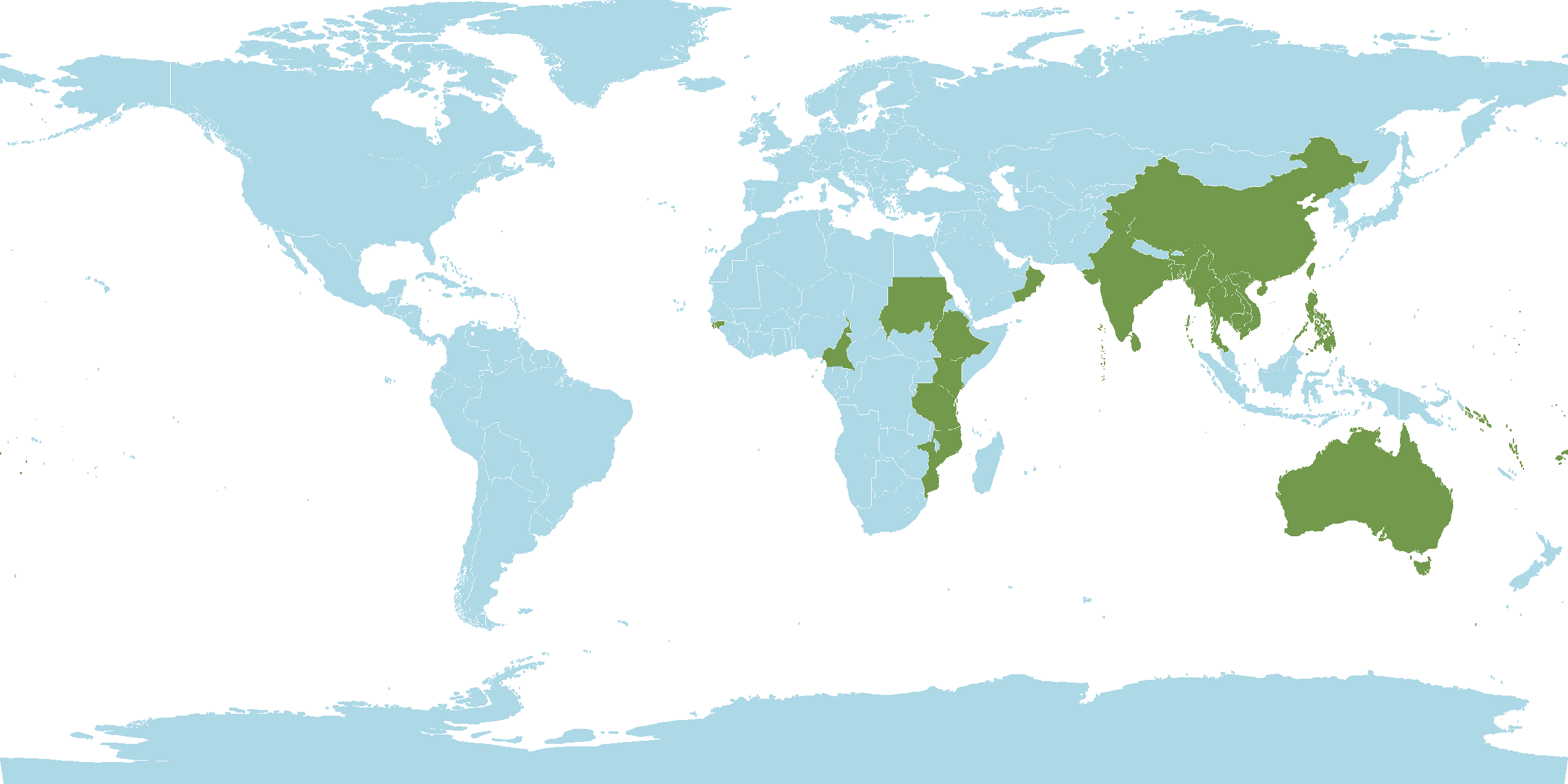 - Native : Andaman Islands, Australia, Bangladesh, Bismarck Archipelago, Cambodia, Cameroon, Caroline Islands, China, Ethiopia, Guinea-Bissau, India, Jawa, Kenya, Lakshadweep Islands, Laos, Lesser Sunda Islands, Malaya, Maldives, Maluku, Marianas, Marshall Islands,