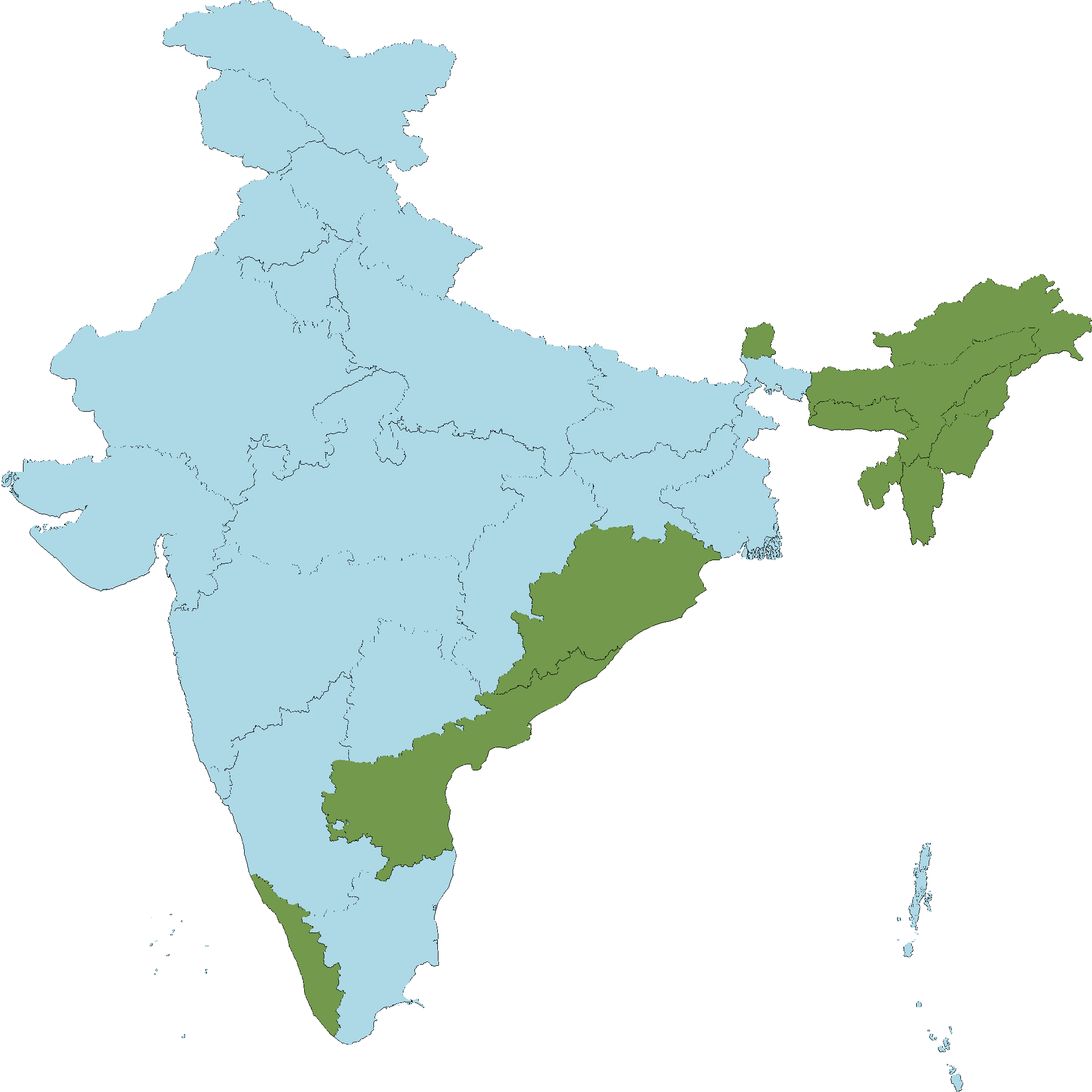Andhra Pradesh : East Godavari district, Vishakapatnam district, Vizianagaram district, West Godavari district, Srikakulam district  Kerala : Kozhikode district  Odisha : Mayurbhanj district, Deogarh district, Sundergarh district, Kalhandi district, Angul district  Sikkim : Sikkim  Arunachal Pradesh : Kameng, Lohit, Siang, Tirap  Meghalaya : Meghalaya  Assam : Assam  Nagaland : Nagaland  Mizoram : Mizoram  Manipur : Manipur  Tripura : Tripura