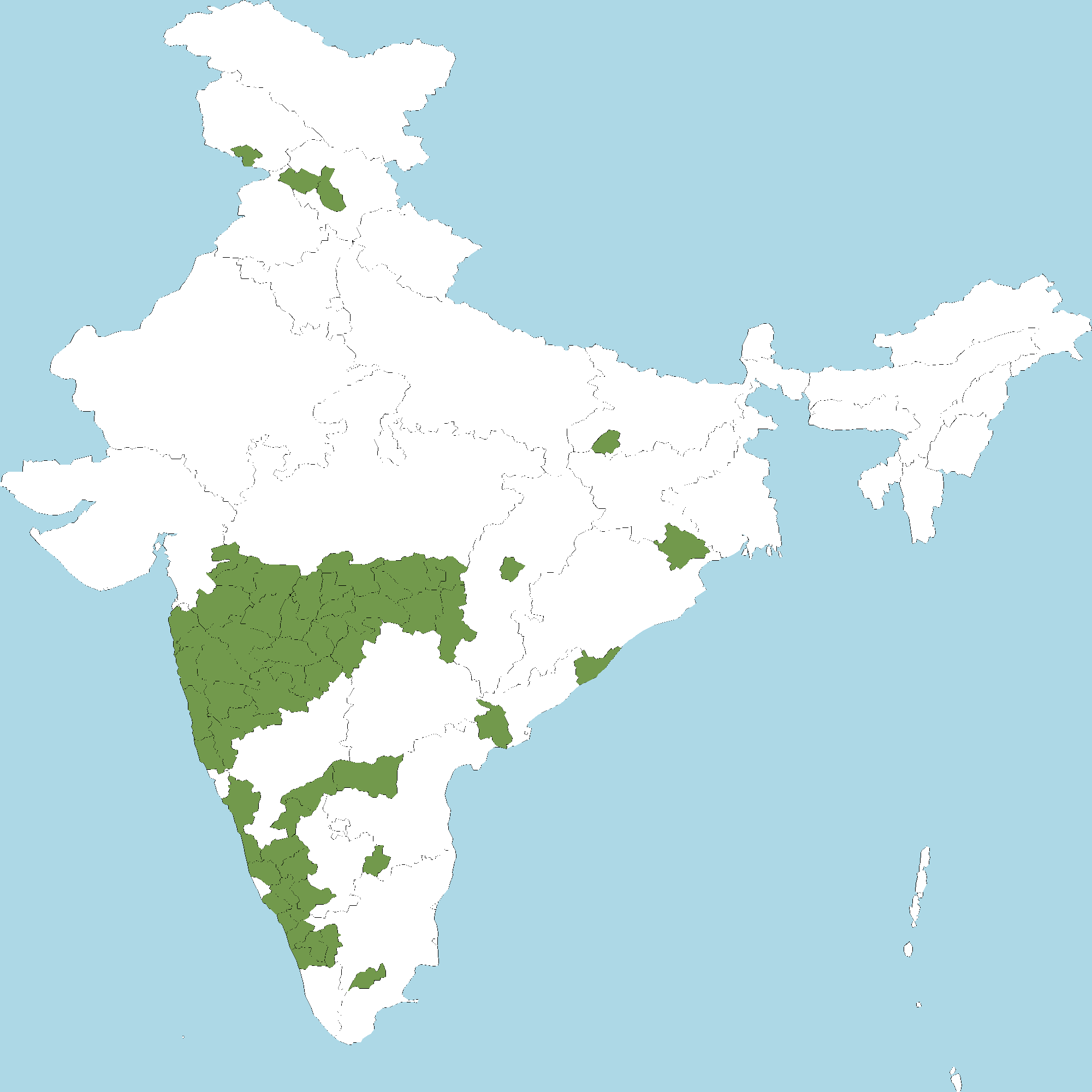 - Karnataka : Ballari district, Chikkamagaluru district, Dakshina Kannada district, Davanagere district, Hassan district, Kodagu (Coorg) district, Kolar district, Mysuru district, Udupi district, Uttara Kannada district