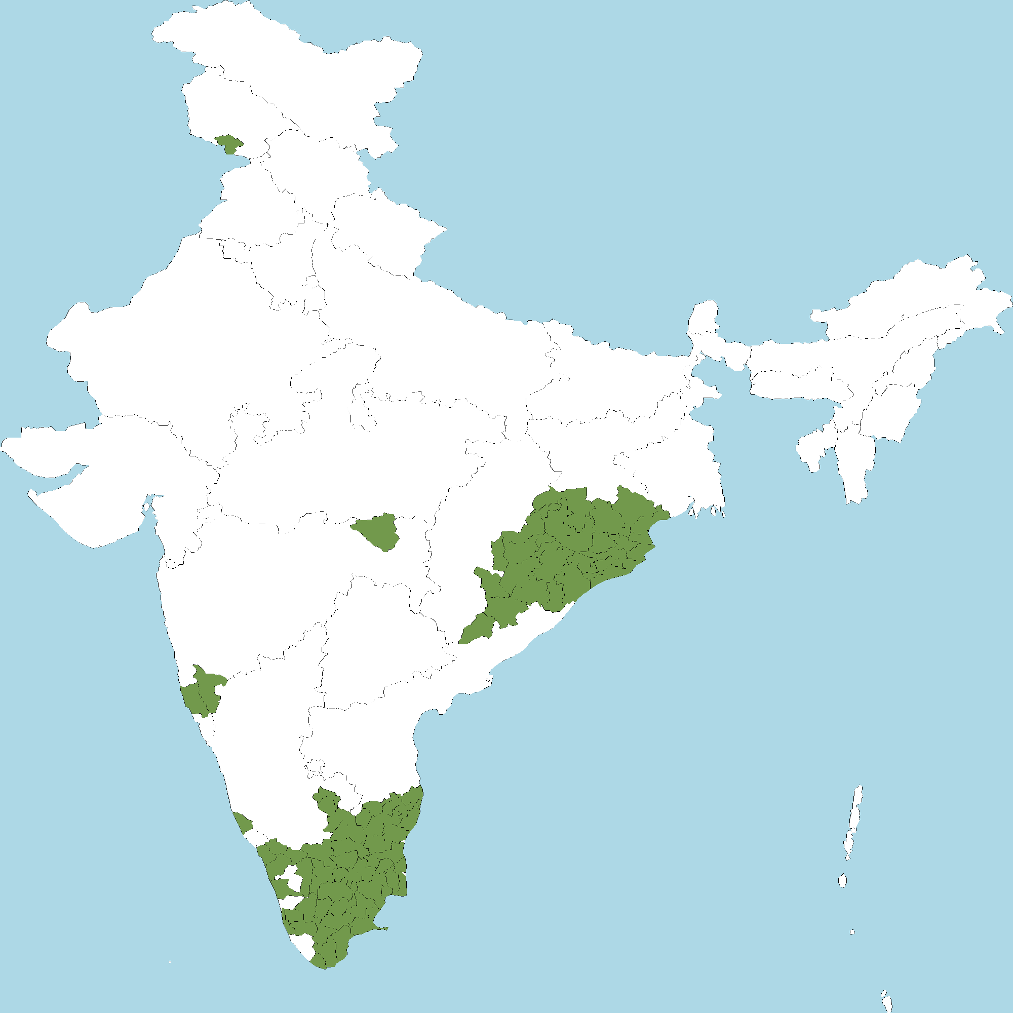 - Kerala : Kasaragod district, Wayanad district, Kozhikode district, Malappuram district, Thrissur district, Idukki district, Kottayam district, Alappuzha district, Pathanamthitta district