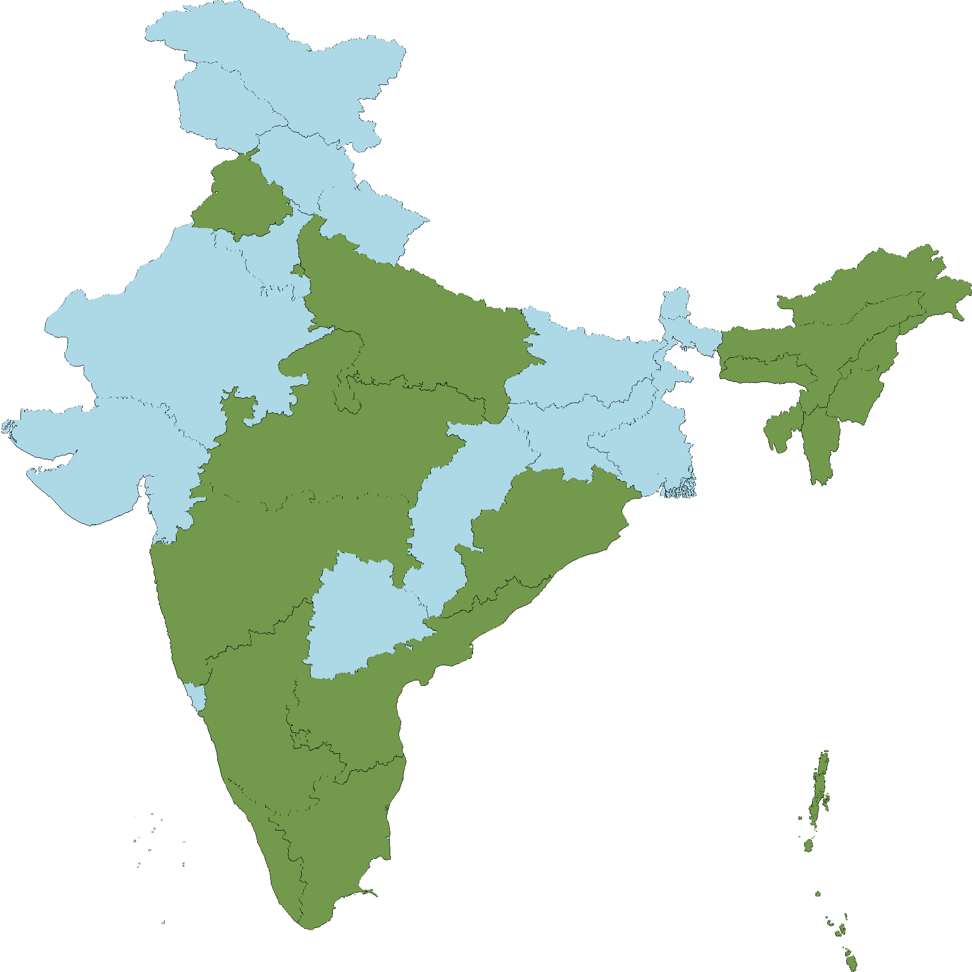 Andhra Pradesh : Chittoor district, Kadapa district, Kurnool district, Nellore district, Vishakapatnam district  Karnataka : Hassan district, Dakshina Kannada district  Kerala : All districts of Kerala  Maharashtra : Maharashtra  Odisha : Odisha  Tamil Nadu : Dindigul district  Madhya Pradesh : Hoshangabad district  Arunachal Pradesh : Subansiri  Meghalaya : Meghalaya  Assam : Assam  Nagaland : Nagaland  Delhi : Delhi  Uttar Pradesh : Uttar Pradesh  Punjab : Punjab  Mizoram : Mizoram  Andaman and Nicobar Islands : Andaman Islands  Manipur : Manipur  Tripura : Tripura