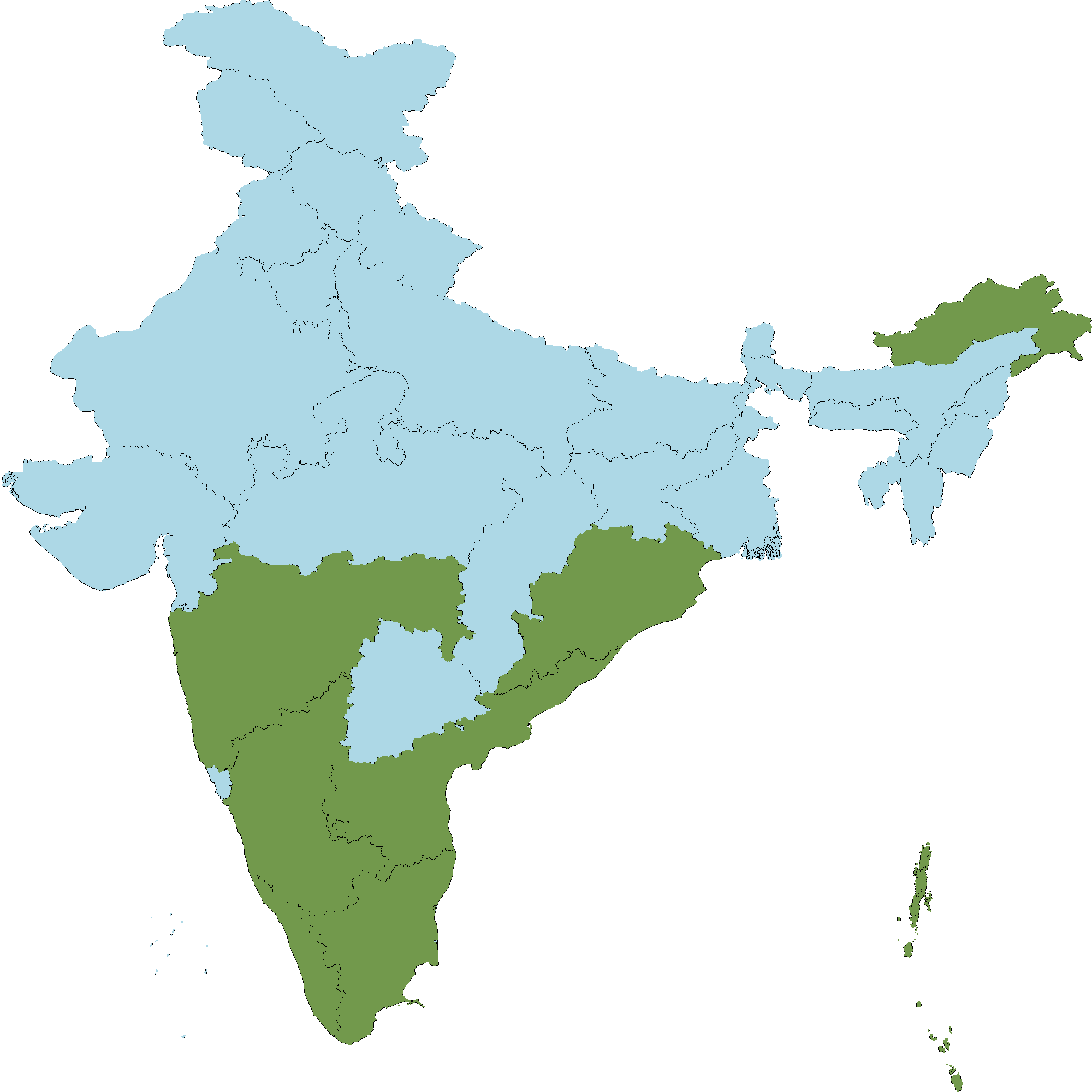 - Karnataka : Dakshina Kannada district, Kodagu (Coorg) district, Mysuru district, Shivamogga district, Udupi district, Uttara Kannada district