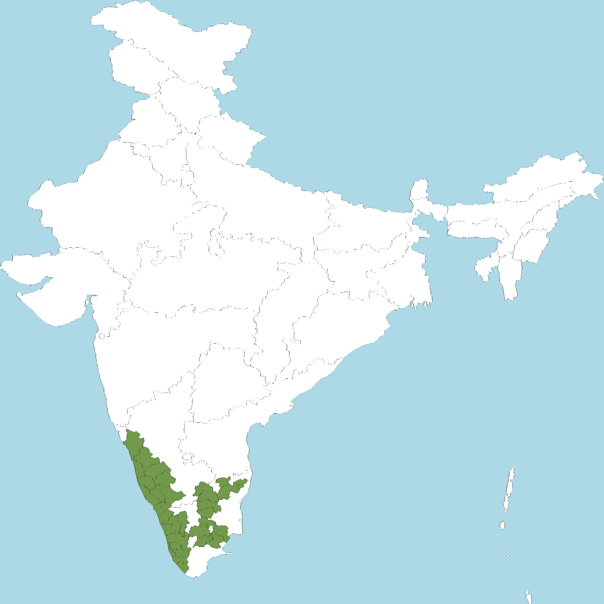 - Karnataka : Chikkamagaluru district, Dakshina Kannada district, Hassan district, Kodagu (Coorg) district, Mysuru district, Shivamogga district, Udupi district, Uttara Kannada district