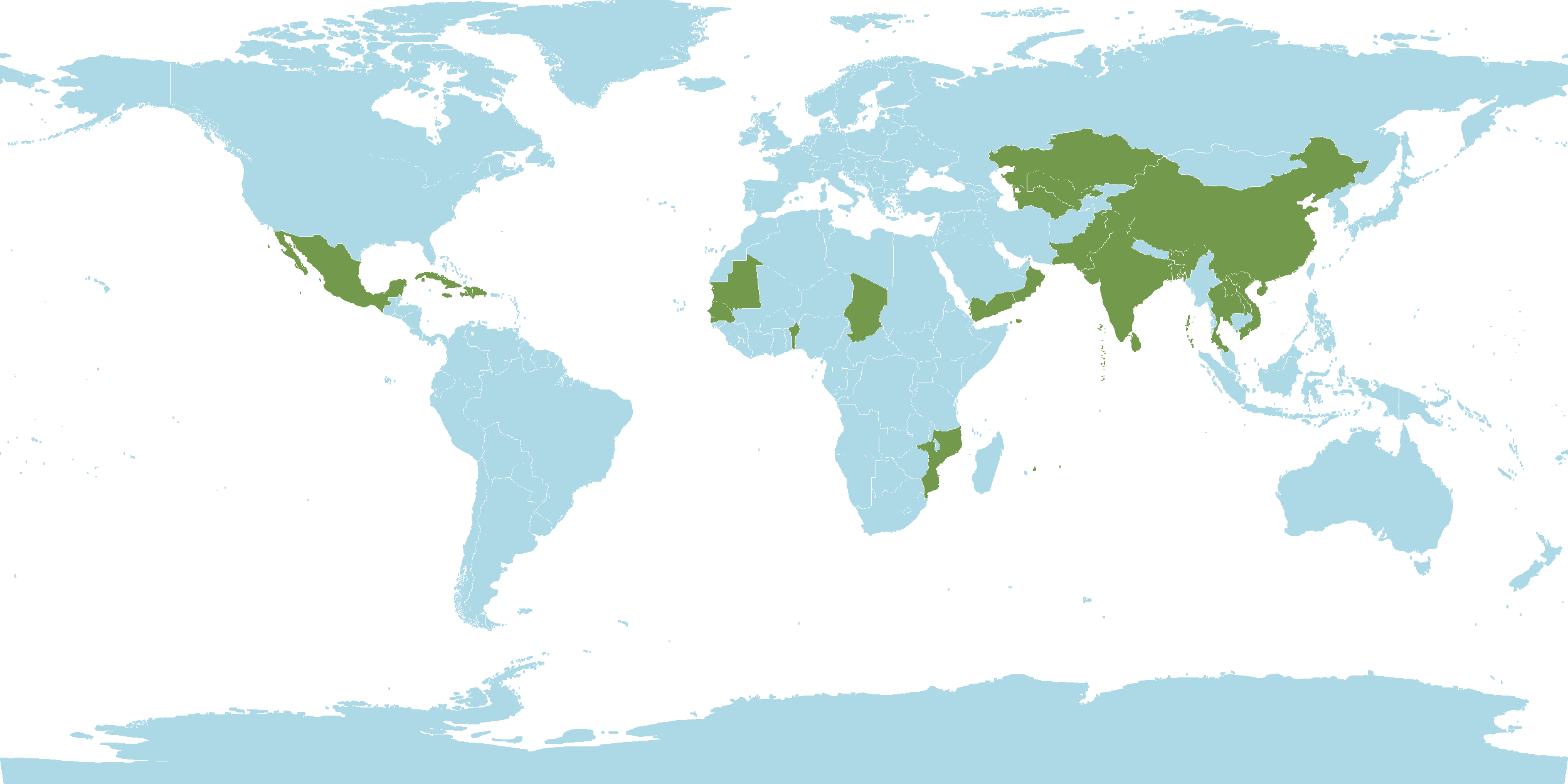 - World Distribution : Bangladesh, Bhutan, India, Pakistan, Sri Lanka, Benin, Burkina, Caroline Islands, Chad, Chagos Archipelago, China, Cuba, Dominican Republic, Gulf of Guinea Islands, Gulf States, Haiti, Jamaica, Kazakhstan, Laos, Leeward Islands, Louisiana, Maldives, Marianas, Mauritania, Mauritius, Mexico, Mozambique, Oman, Puerto Rico, Réunion, Senegal, Tadzhikistan, Thailand, Transcaucasus, Trinidad-Tobago, Turkmenistan, Uzbekistan, Vietnam, Virginia, Windward Islands, Yemen, Zaïre