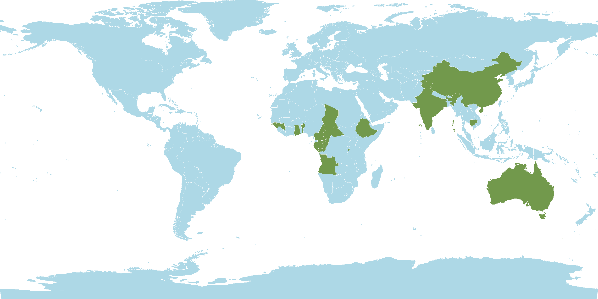 - Native : Andaman Islands, Angola, Australia, Benin, Bismarck Archipelago, Borneo, Burkina, Burundi, Cambodia, Cameroon, Central African Republic, Chad, China, Congo, Ethiopia, Gabon, Gambia, Ghana, Guinea, Guinea-Bissau, Gulf of Guinea Islands, Hainan, India, Ivor