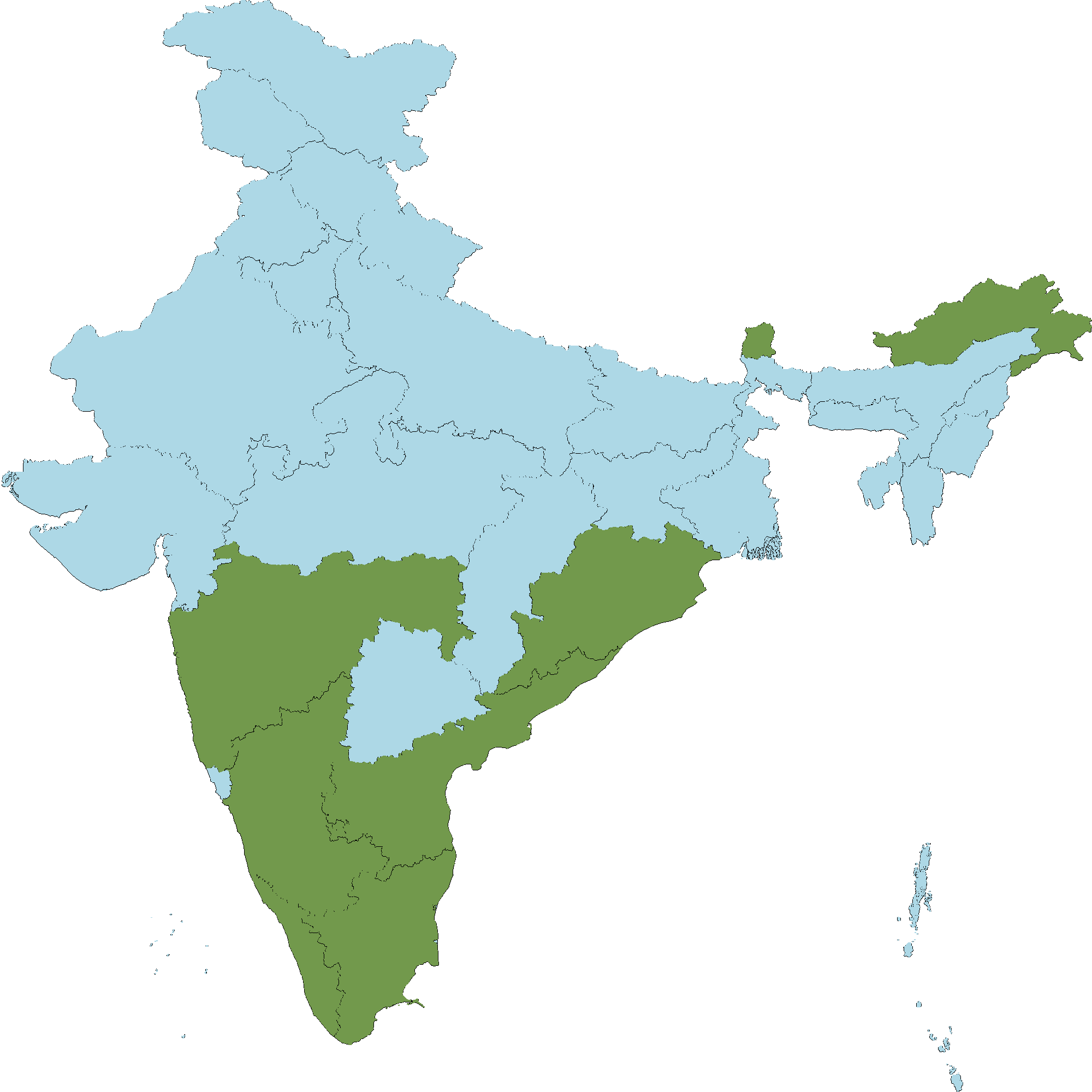 - Karnataka : Dakshina Kannada district, Kodagu (Coorg) district, Udupi district, Uttara Kannada district, Belagavi district, Chikkamagaluru district, Davanagere district, Hassan district, Shivamogga district