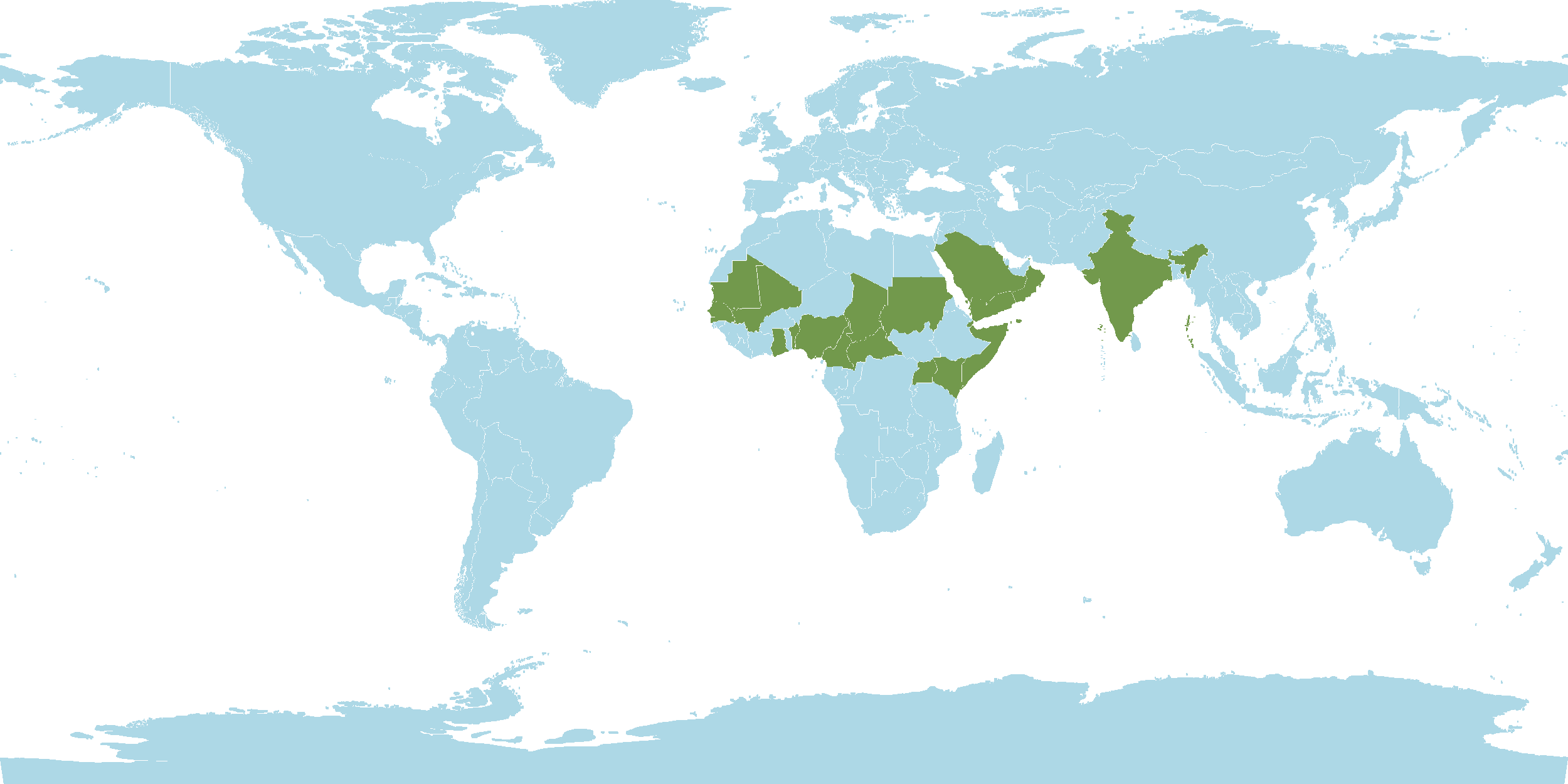 -  Native : Benin, Burkina, Cameroon, Central African Republic, Chad, Djibouti, Ghana, India, Kenya, Mali, Mauritania, Nigeria, Oman, Saudi Arabia, Senegal, Somalia, Sudan, Uganda, Yemen, Zaïre