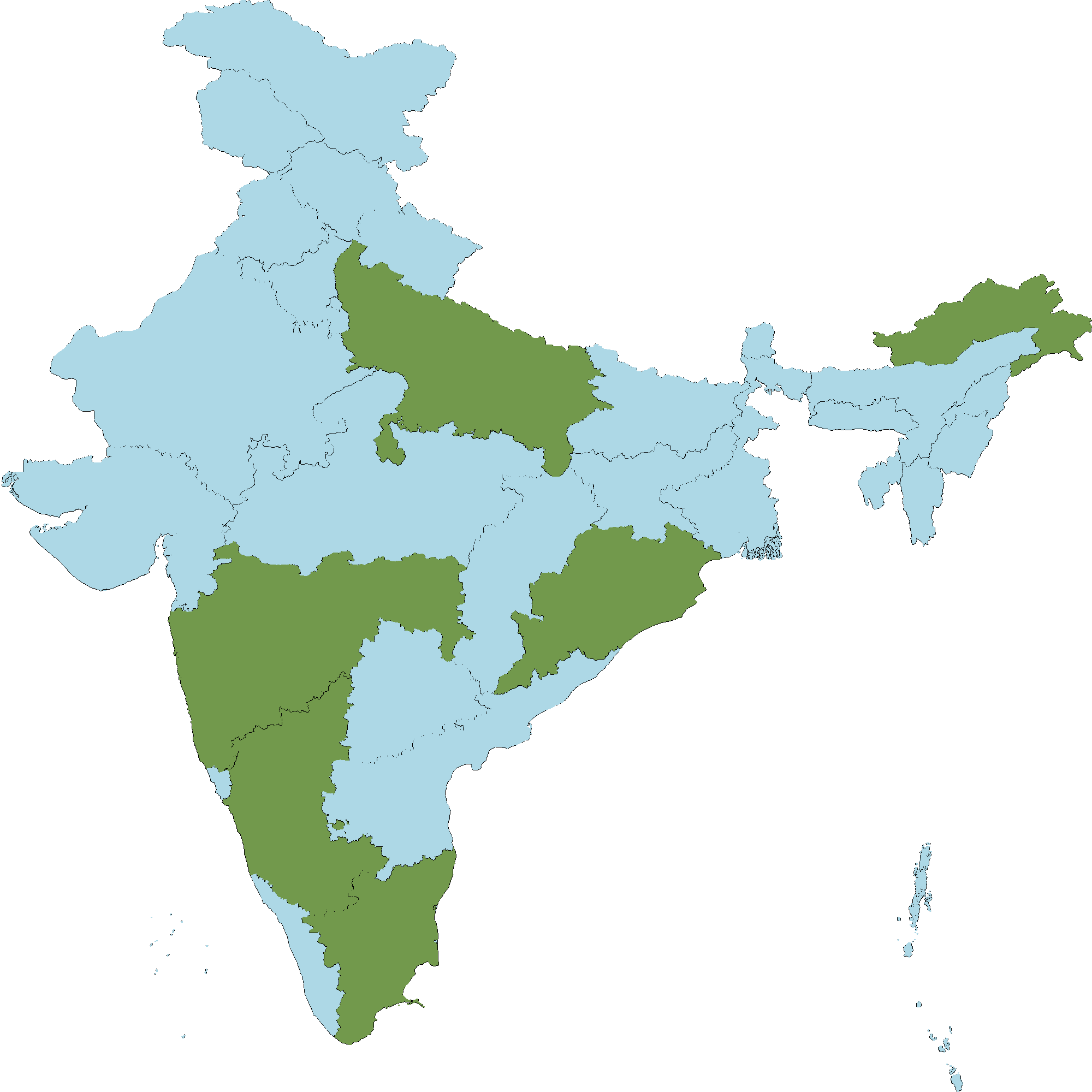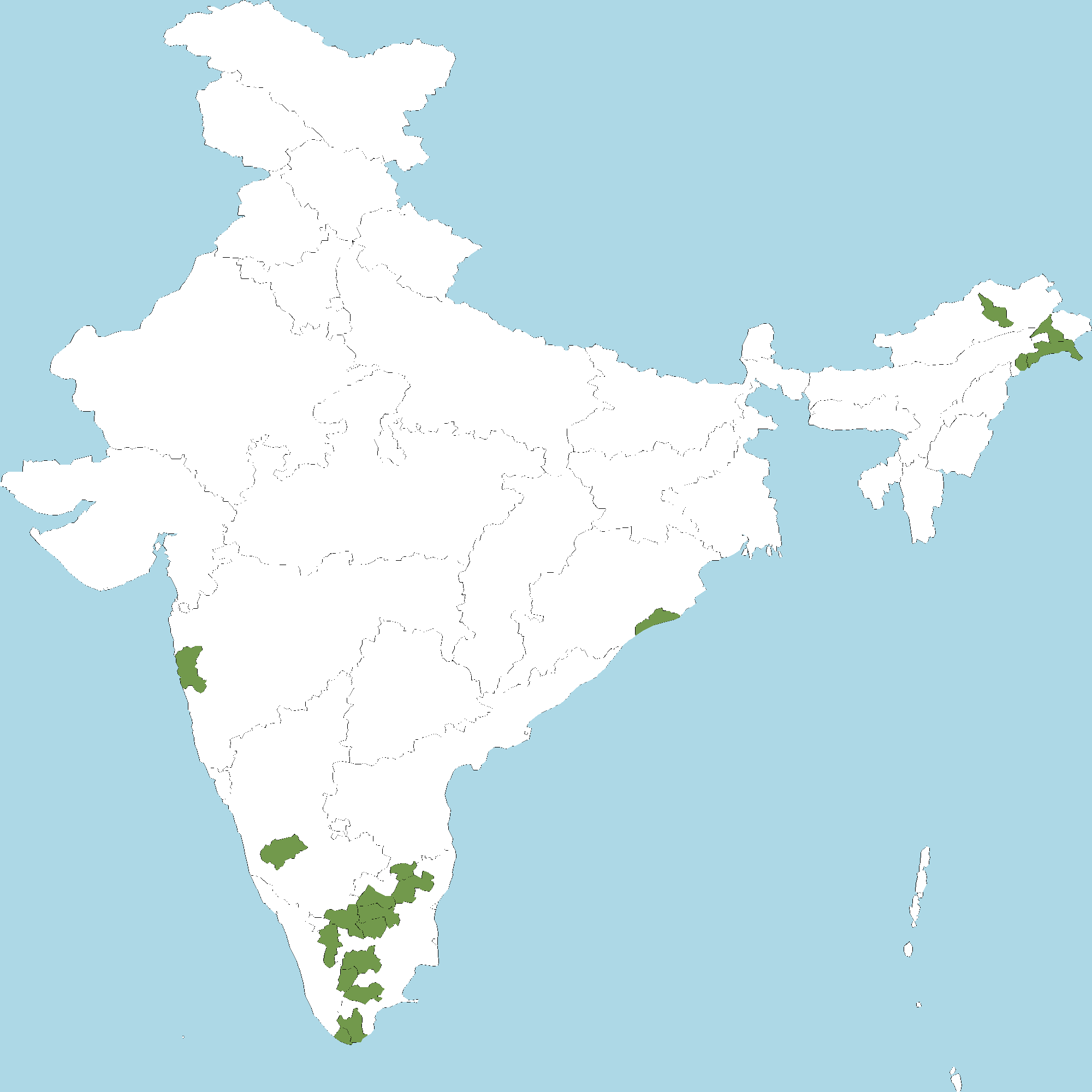 - Tamil Nadu : Dindigul district, Vellore district, Tiruvannamalai district, Salem district, Coimbatore district, Dharmapuri district, Erode district, Kanyakumari district, Namakkal district, The Nilgiri district, Theni district, Tirunelveli district, Villipuram district, Virudhunagar district
