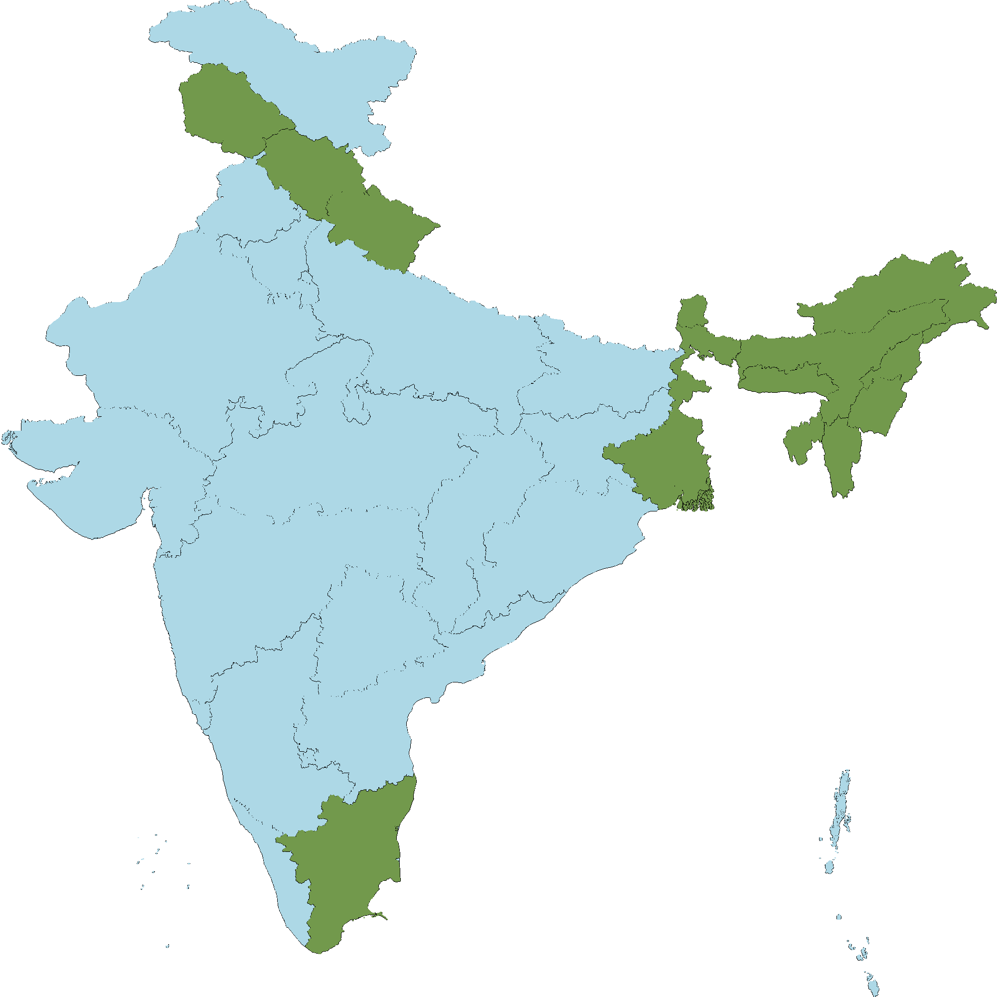 - Himachal Pradesh : Chamba district, Kinnaur district, Kullu district, Lahaul & Spiti district, Shimla district, Sirmaur district