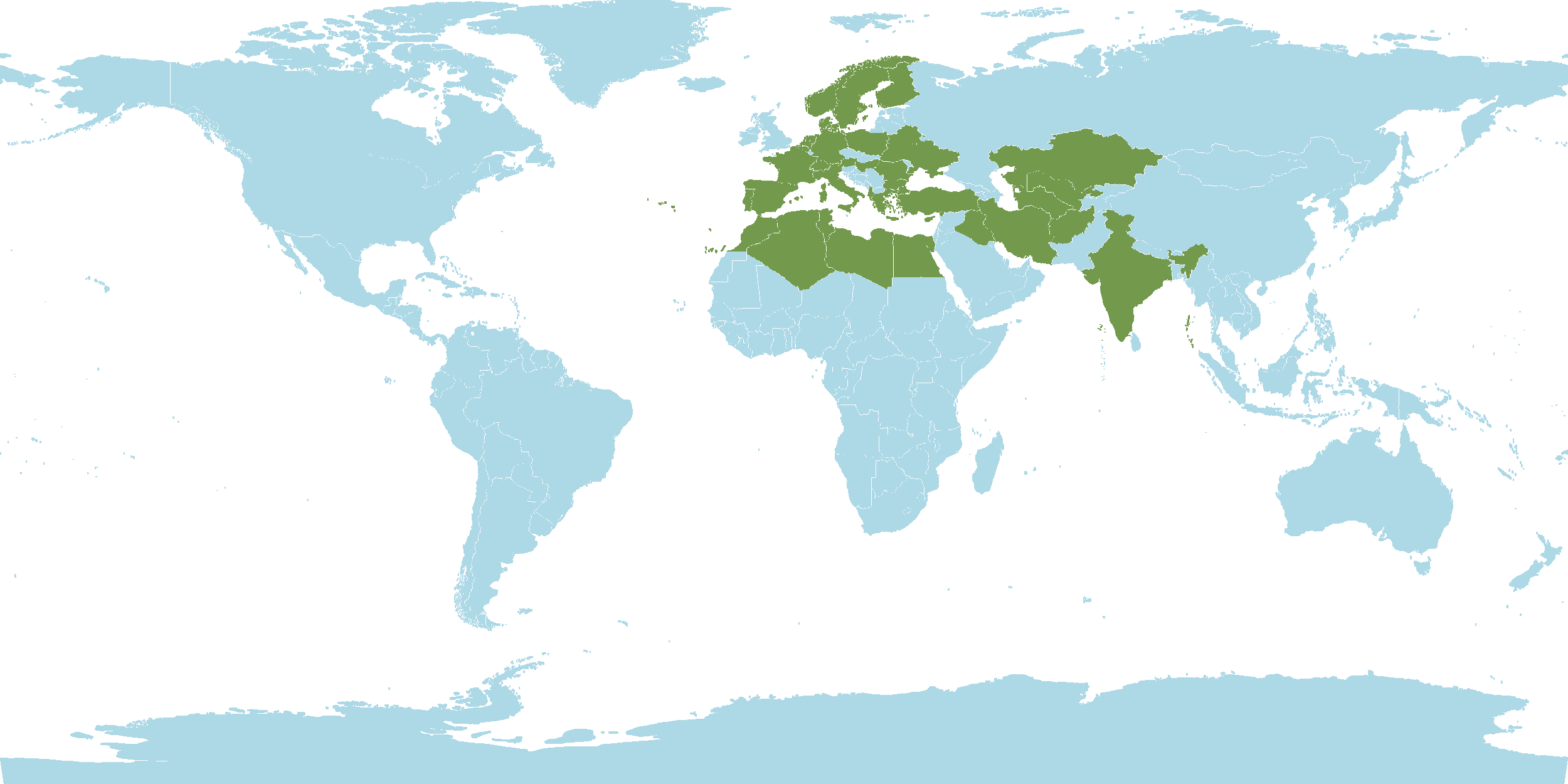 - World Distribution : Afghanistan, Albania, Algeria, Altay, Austria, Azores, Baleares, Baltic States, Belarus, Belgium, Bulgaria, Central European Russia, Corse, Cyprus, Czechoslovakia, Denmark, East Aegean Islands, East European Russia, Egypt, Finland, France, Germany, Greece, Hungary, India, Iran, Iraq, Italy, Kazakhstan, Kirgizstan, Kriti, Krym, Lebanon-Syria, Libya, Madeira, Morocco, Netherlands, North Caucasus, North European Russia, Northwest European Russia, Norway, Palestine, Poland, Portugal, Romania, Sardegna, Sicilia, Sinai, South European Russia, Spain, Sweden, Switzerland, Tadzhikistan, Tibet, Transcaucasus, Tunisia, Turkey, Turkey-in-Europe, Turkmenistan, Ukraine, Uzbekistan, Yugoslavia