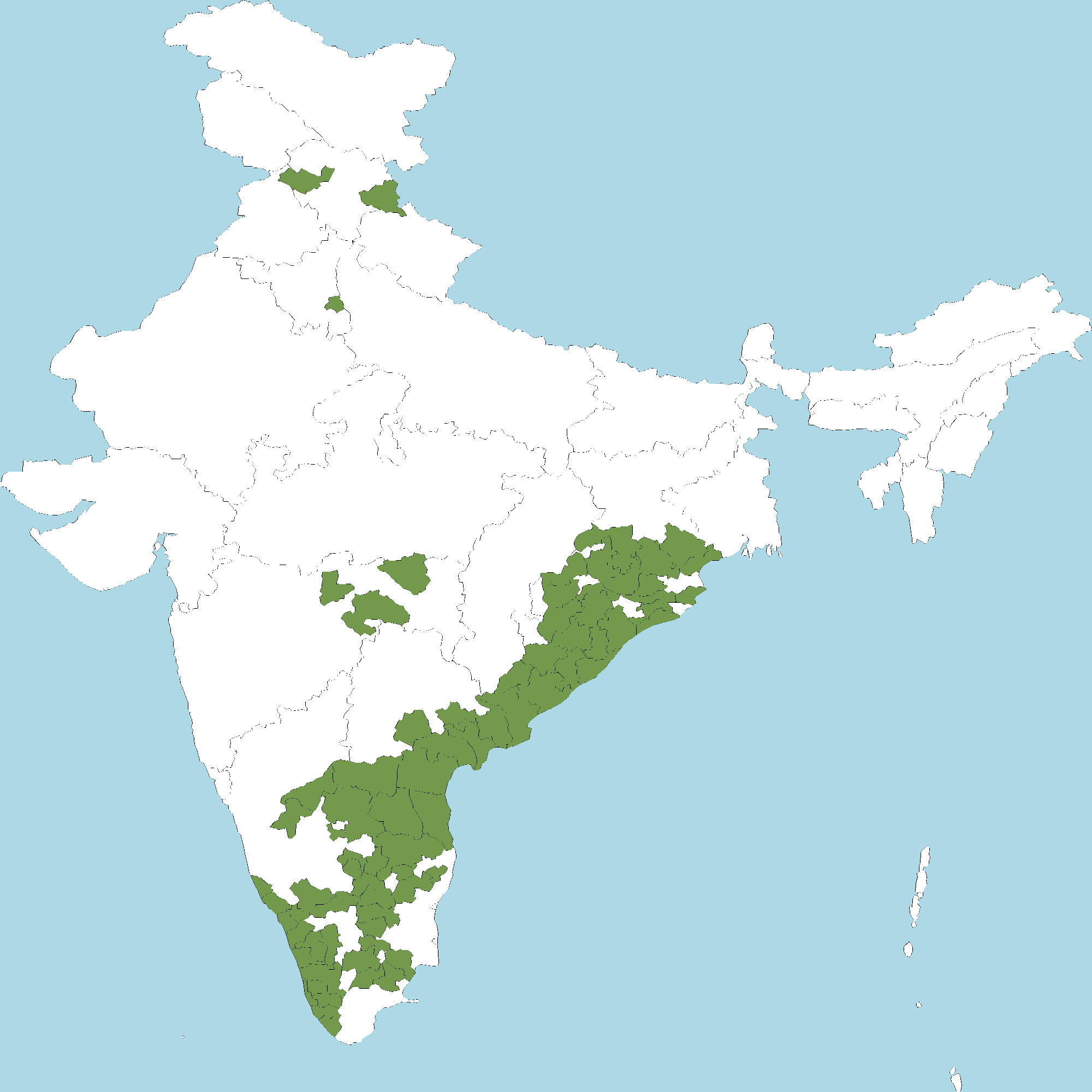 - Andhra Pradesh : Anantapur district, Chittoor district, Y.S.R. Kadapa district, East Godavari district, Guntur district, Krishna district, Kurnool district, S.P.S. Nellore district, Prakasam district, Srikakulam district, Visakhapatnam district, Vizianagaram district, West Godavari district