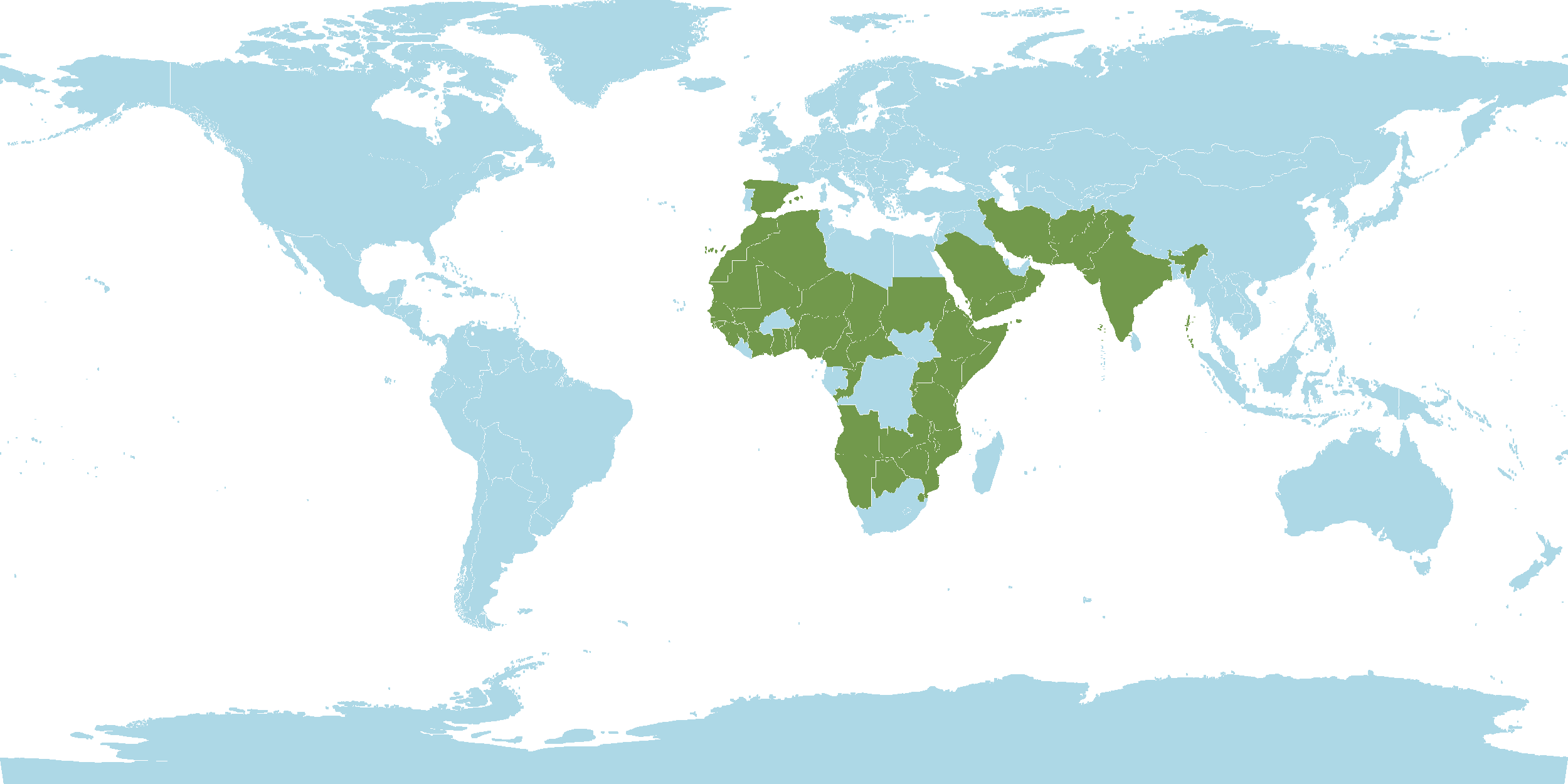 - World Distribution : Afghanistan, Algeria, Angola, Benin, Botswana, Burkina, Burundi, Cameroon, Canary Islands, Caprivi Strip, Central African Republic, Chad, Congo, Djibouti, Eritrea, Ethiopia, Gambia, Ghana, Guinea, Guinea-Bissau, India, Iran, Ivory Coast, Kenya, KwaZulu-Natal, Malawi, Mali, Mauritania, Morocco, Mozambique, Namibia, Niger, Nigeria, Northern Provinces, Oman, Pakistan, Rwanda, Saudi Arabia, Senegal, Sierra Leone, Somalia, Spain, Sudan, Swaziland, Tanzania, Togo, Uganda, Western Sahara, Yemen, Zambia, Zaïre, Zimbabwe