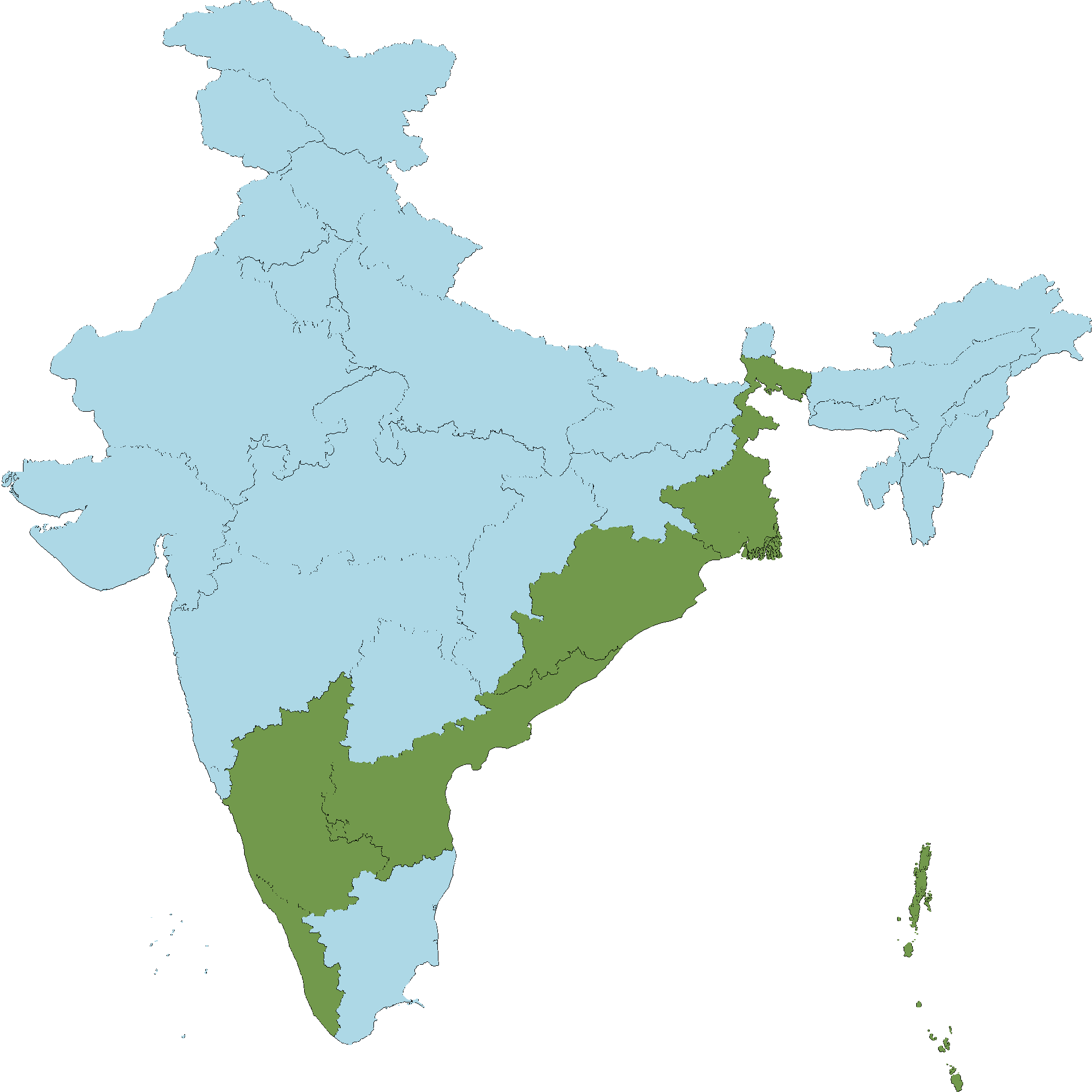 - Andhra Pradesh : Chittoor district, Visakhapatnam district, East Godavari district, West Godavari district, Srikakulam district, Y.S.R. Kadapa district