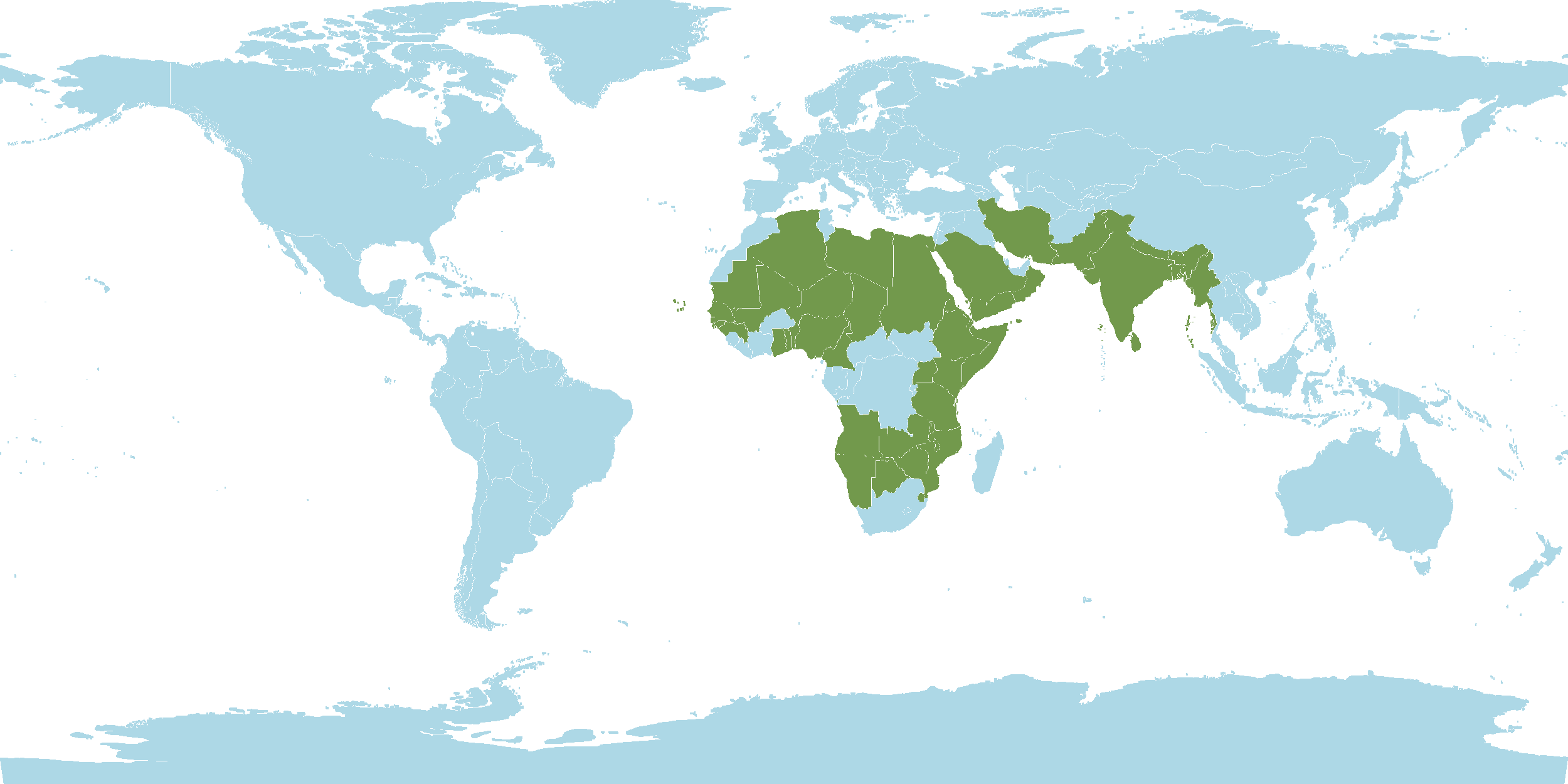 - World Distribution : Algeria, Angola, Bangladesh, Benin, Bhutan, Botswana, Burkina, Cameroon, Cape Verde, Caprivi Strip, Central African Repu, Chad, Djibouti, Egypt, Eritrea, Ethiopia, Gambia, Ghana, Guinea, Guinea-Bissau, Gulf States, India, Iran, Kenya, KwaZulu-Natal, Libya, Malawi, Mali, Mauritania, Mozambique, Myanmar, Namibia, Nepal, Niger, Nigeria, Northern Provinces, Oman, Pakistan, Saudi Arabia, Senegal, Somalia, Sri Lanka, Sudan, Swaziland, Tanzania, Togo, Uganda, Yemen, Zambia, Zimbabwe