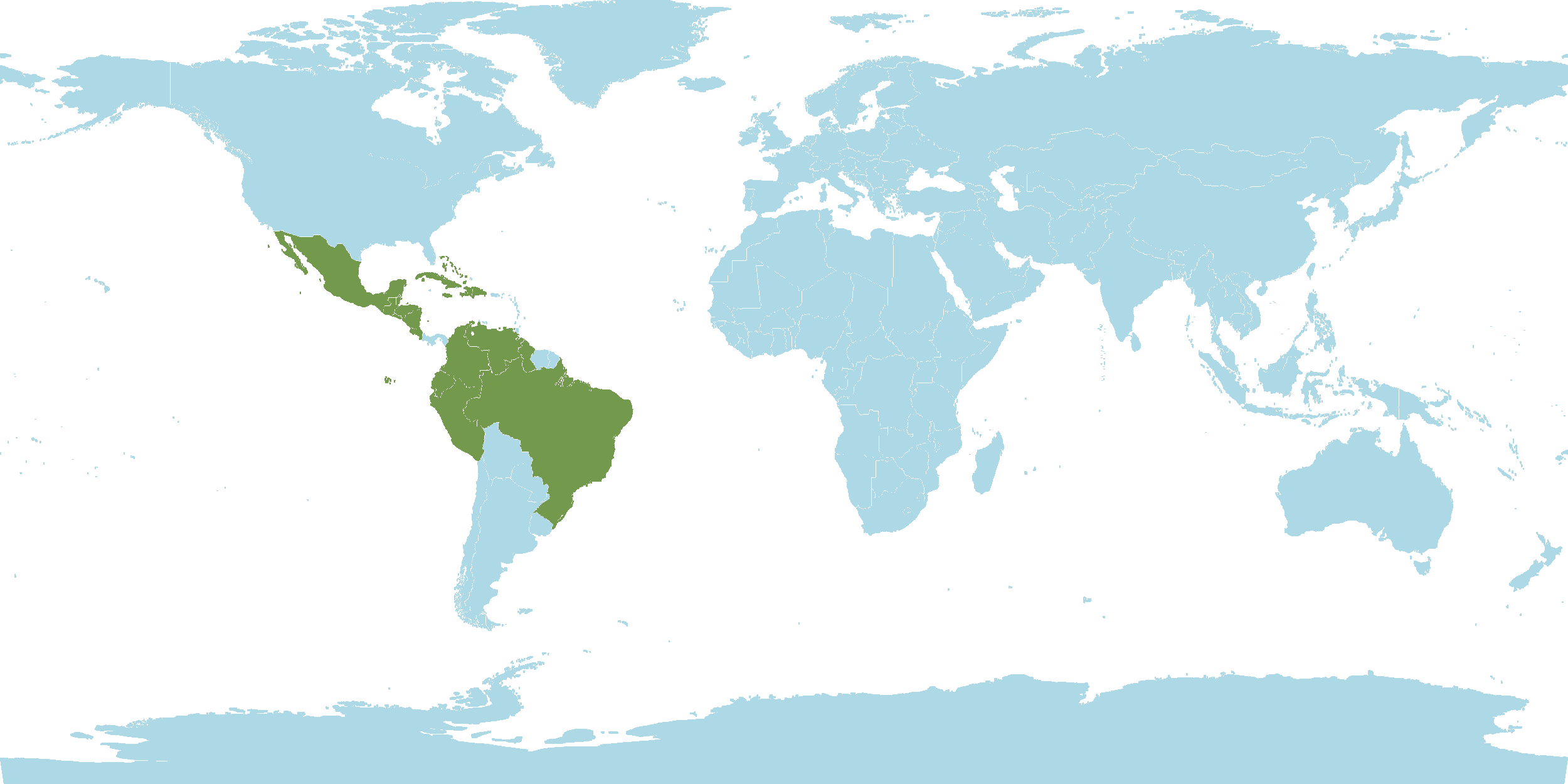 - World Distribution : Bahamas, Belize, Brazil, Colombia, Costa Rica, Cuba, Dominican Republic, Ecuador, El Salvador, Florida, Guatemala, Guyana, Haiti, Honduras, Jamaica, Leeward Islands, Mexico, Nicaragua, Panamá, Peru, Puerto Rico, Trinidad-Tobago, Venezuela, Windward Islands