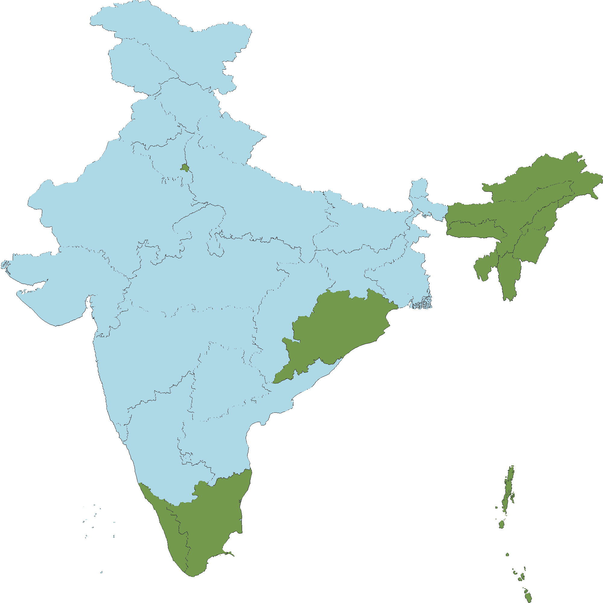 - Tamil Nadu : Coimbatore district, Kanyakumari district, Madurai district, The Nilgiri district, Tirunelveli district