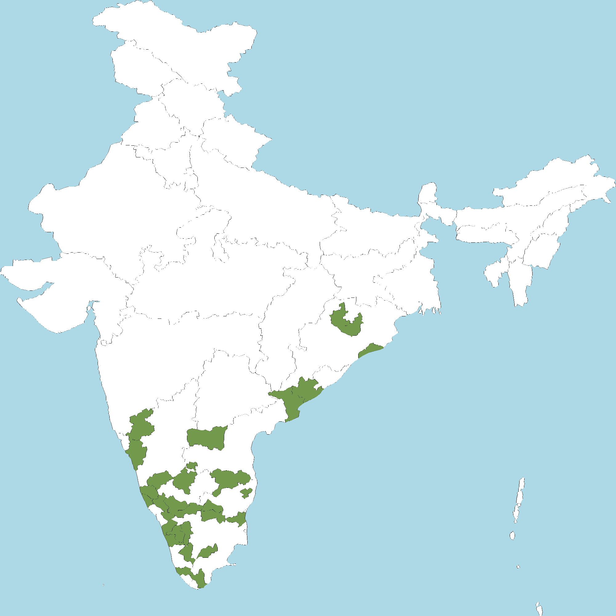 - Karnataka : Belagavi district, Uttara Kannada district, Dakshina Kannada district, Chamarajanagara district, Chikkamagaluru district, Kodagu (Coorg) district, Mysuru district, Tumakuru district