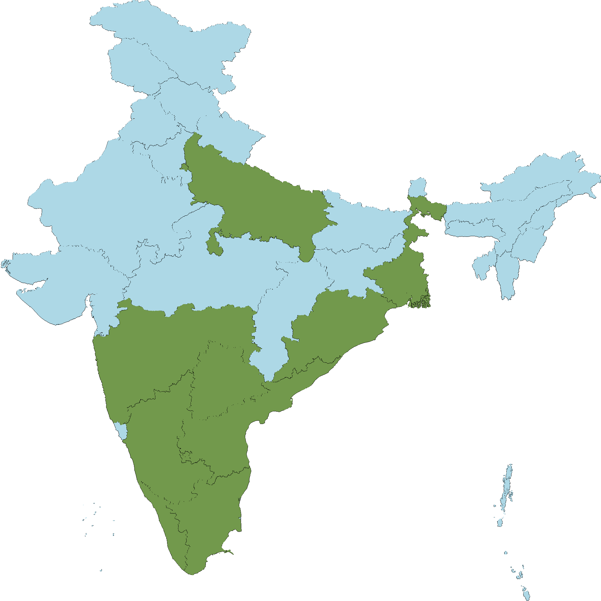 - Andhra Pradesh : Anantapur district, Chittoor district, Kadapa district, East Godavari district, Guntur district, Krishna district, Kurnool district, Nellore district, Prakasam district, Srikakulam district, Vishakapatnam district, Vizianagaram district, West Godavari district