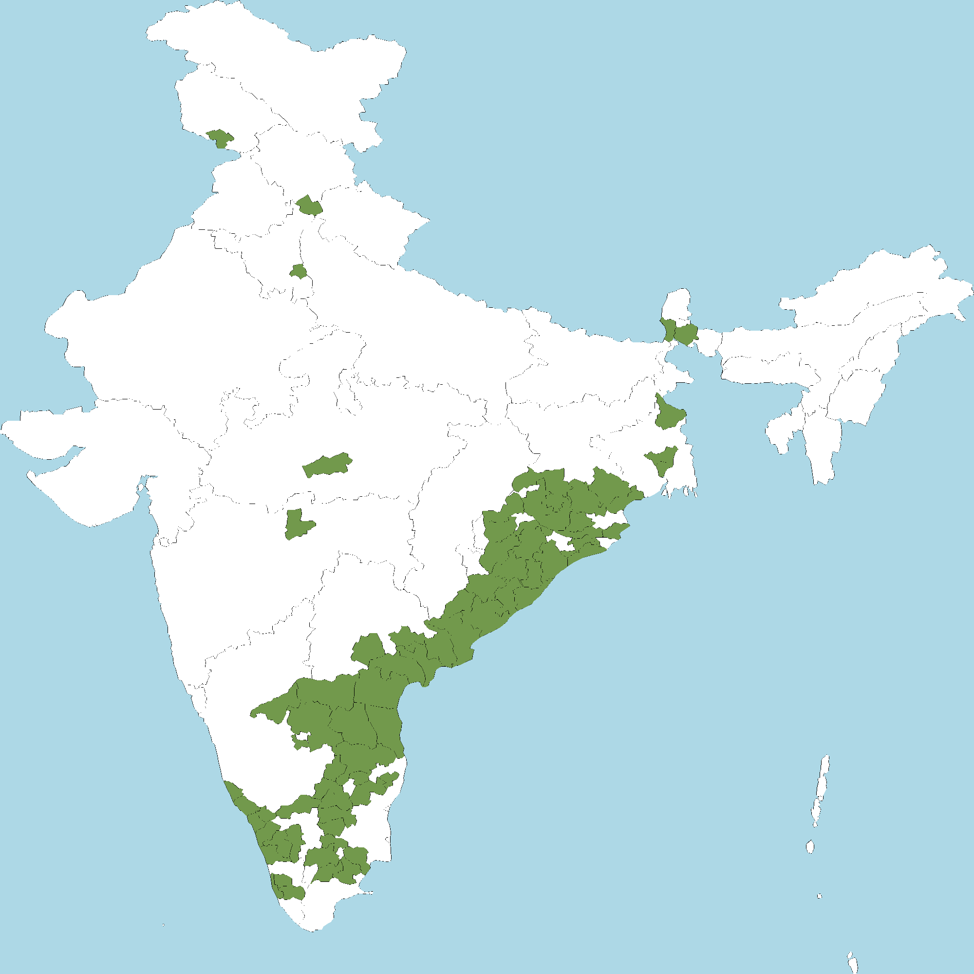 - Andhra Pradesh : Anantapur district, Chittoor district, Y.S.R. Kadapa district, East Godavari district, Guntur district, Krishna district, Kurnool district, S.P.S. Nellore district, Prakasam district, Srikakulam district, Visakhapatnam district, Vizianagaram district, West Godavari district
