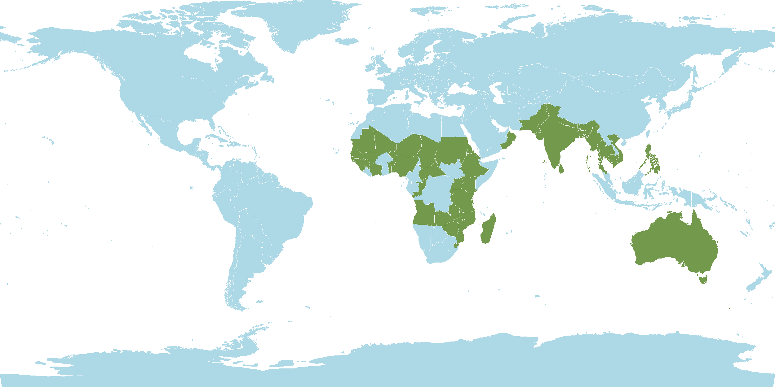 - World Distribution : Andaman and Nicobar Islands, Angola, Australia, Bangladesh, Benin, Bhutan, Borneo, Burkina, Burundi, Cambodia, Central African Republic, Chad, Congo, Eritrea, Ethiopia, Gambia, Guinea, Guinea-Bissau, India, Ivory Coast, Jawa, Kenya, KwaZulu-Natal, Lesser Sunda Islands, Madagascar, Malawi, Malaya, Mali, Mauritania, Mozambique, Myanmar, Nansei-shoto, Nepal, New Guinea, Niger, Nigeria, Northern Provinces, Oman, Pakistan, Philippines, Rwanda, Senegal, Sierra Leone, Sri Lanka, Sudan, Sulawesi, Sumatera, Swaziland, Tanzania, Thailand, Togo, Uganda, Vietnam, Zambia, Zaïre, Zimbabwe
