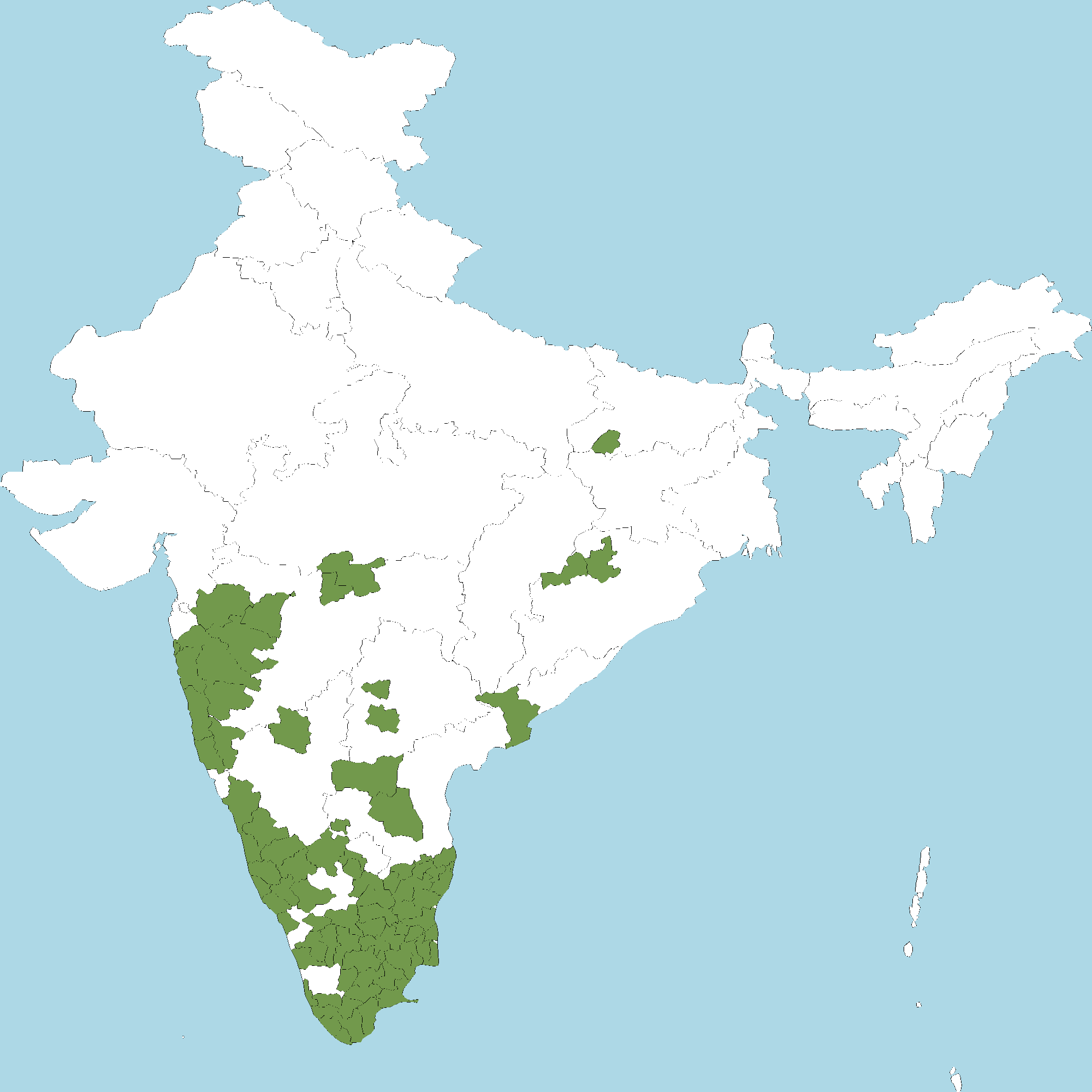 - Kerala : Kasaragod district, Kannur district, Kozhikode district, Palakkad district, Thrissur district, Alappuzha district, Pathanamthitta district, Kollam district, Thiruvananthapuram district