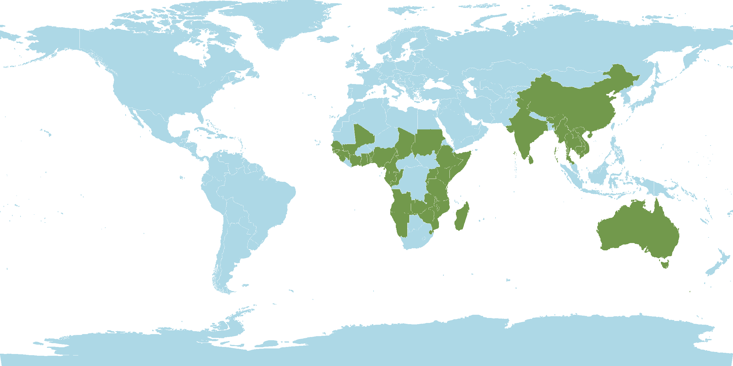- World Distribution : Angola, Australia, Benin, Bhutan, Burkina, Burundi, Cambodia, Cameroon, Caprivi Strip, Central African Repu, Chad, China, Congo, Equatorial Guinea, Ethiopia, Gabon, Ghana, Guinea, Guinea-Bissau, Hainan, India, Ivory Coast, Kenya, KwaZulu-Natal, Laos, Madagascar, Malawi, Mali, Mozambique, Myanmar, Namibia, Nigeria, Northern Provinces, Rwanda, Senegal, Sierra Leone, Somalia, Sri Lanka, Sudan, Swaziland, Tanzania, Thailand, Togo, Uganda, Vietnam, Zambia, Zaïre, Zimbabwe