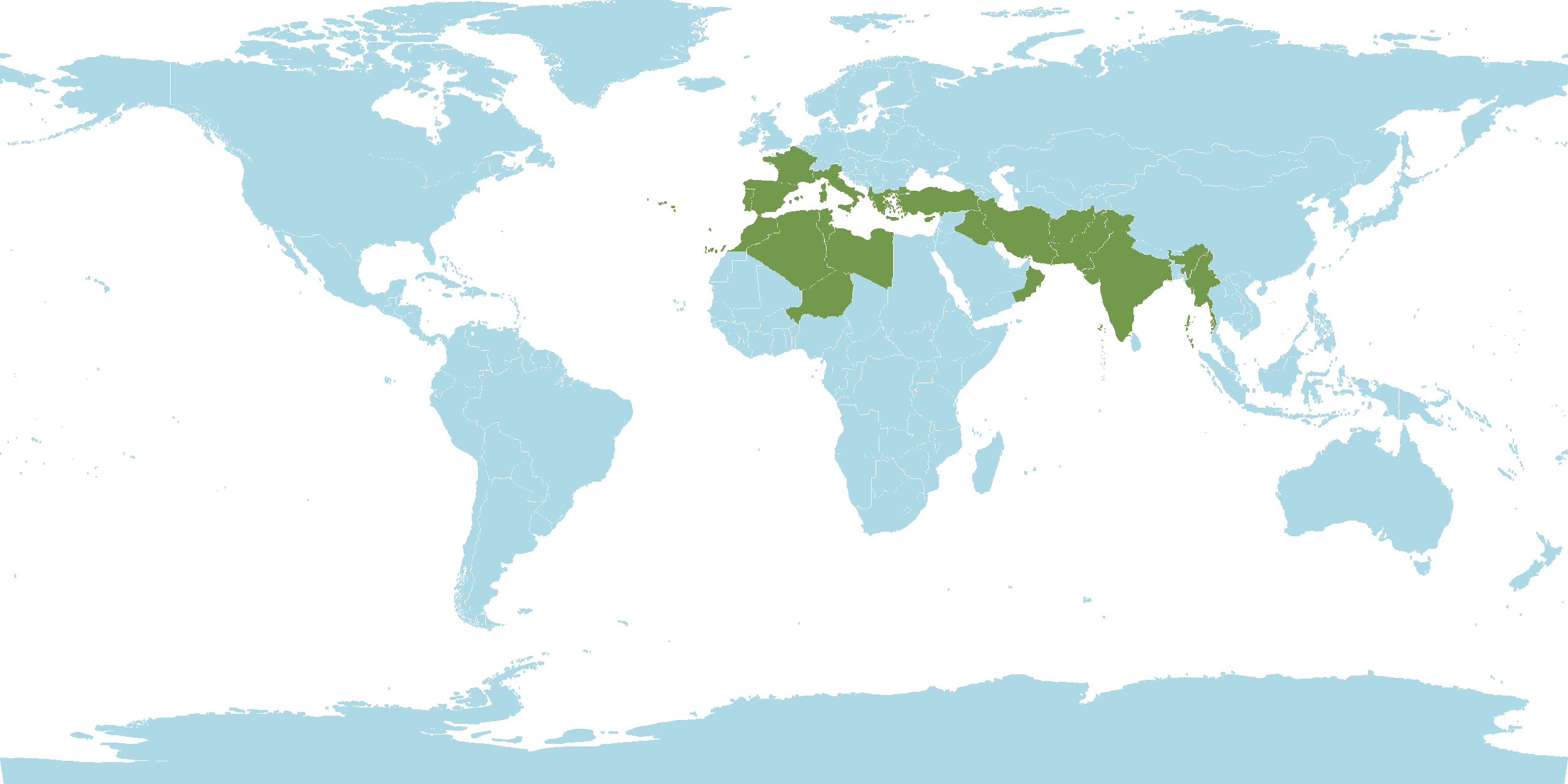 - Native : Afghanistan, Albania, Algeria, Baleares, Corse, Cyprus, East Aegean Islands, France, Greece, Gulf States, India, Iran, Iraq, Italy, Lebanon-Syria, Libya, Morocco, Myanmar, Niger, Oman, Pakistan, Palestine, Portugal, Sardegna, Sicilia, Spain, Tunisia, Turk