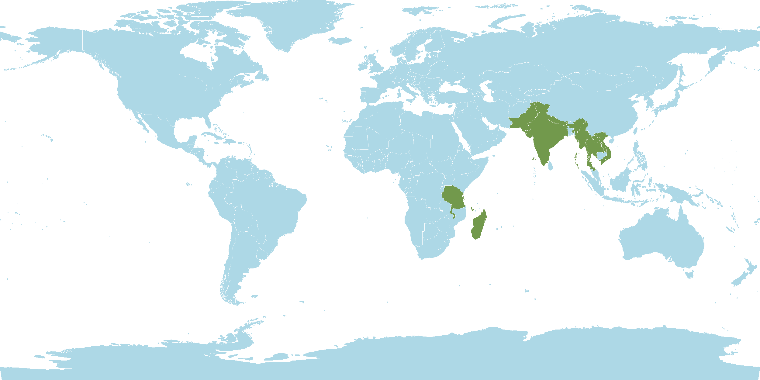 - Native : Andaman and Nicobar Islands, Comoros, Hainan, India, Jawa, Laos, Lesser Sunda Islands, Madagascar, Malawi, Malaya, Myanmar, Nepal, Pakistan, Sumatera, Tanzania, Thailand, Vietnam, Zaïre