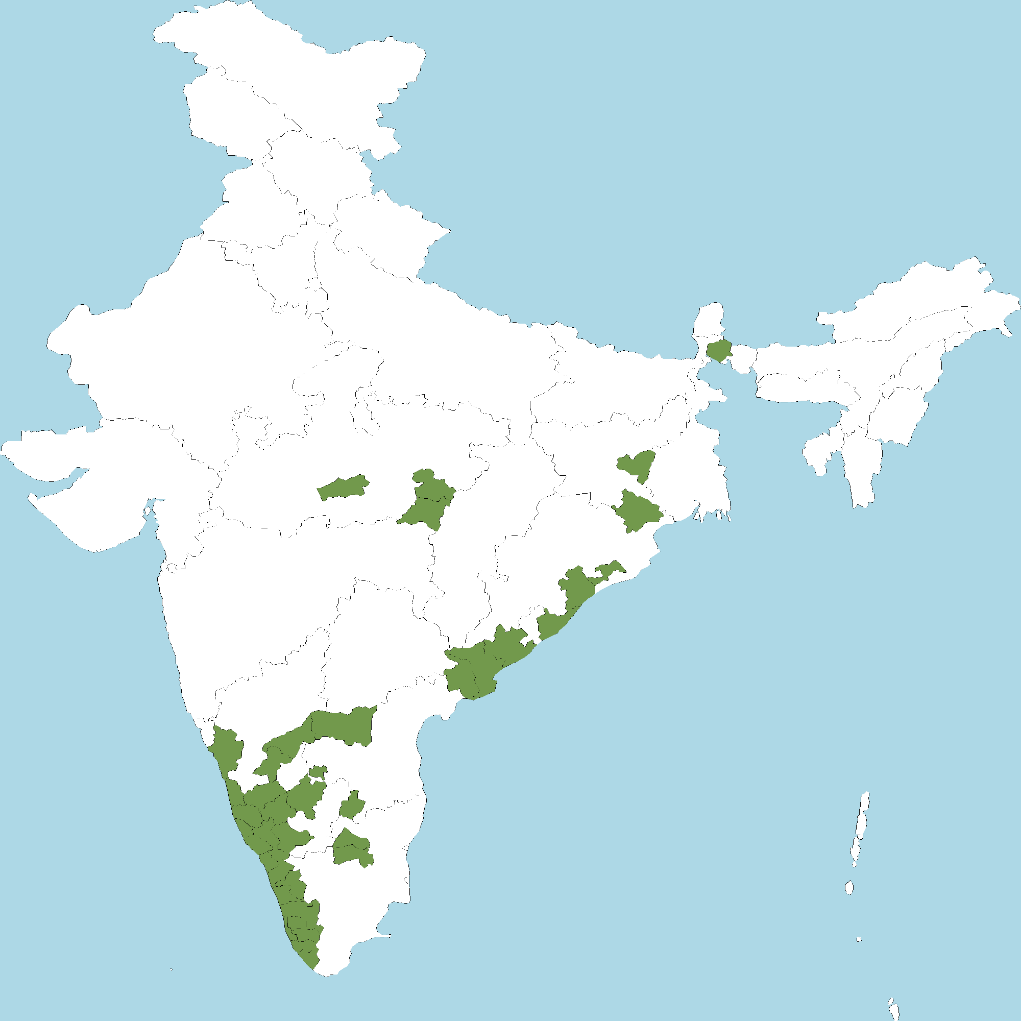 - Karnataka : Ballari district, Kolar district, Chikkamagaluru district, Davanagere district, Hassan district, Kodagu (Coorg) district, Mysuru district, Tumakuru district, Udupi district, Uttara Kannada district, Dakshina Kannada district