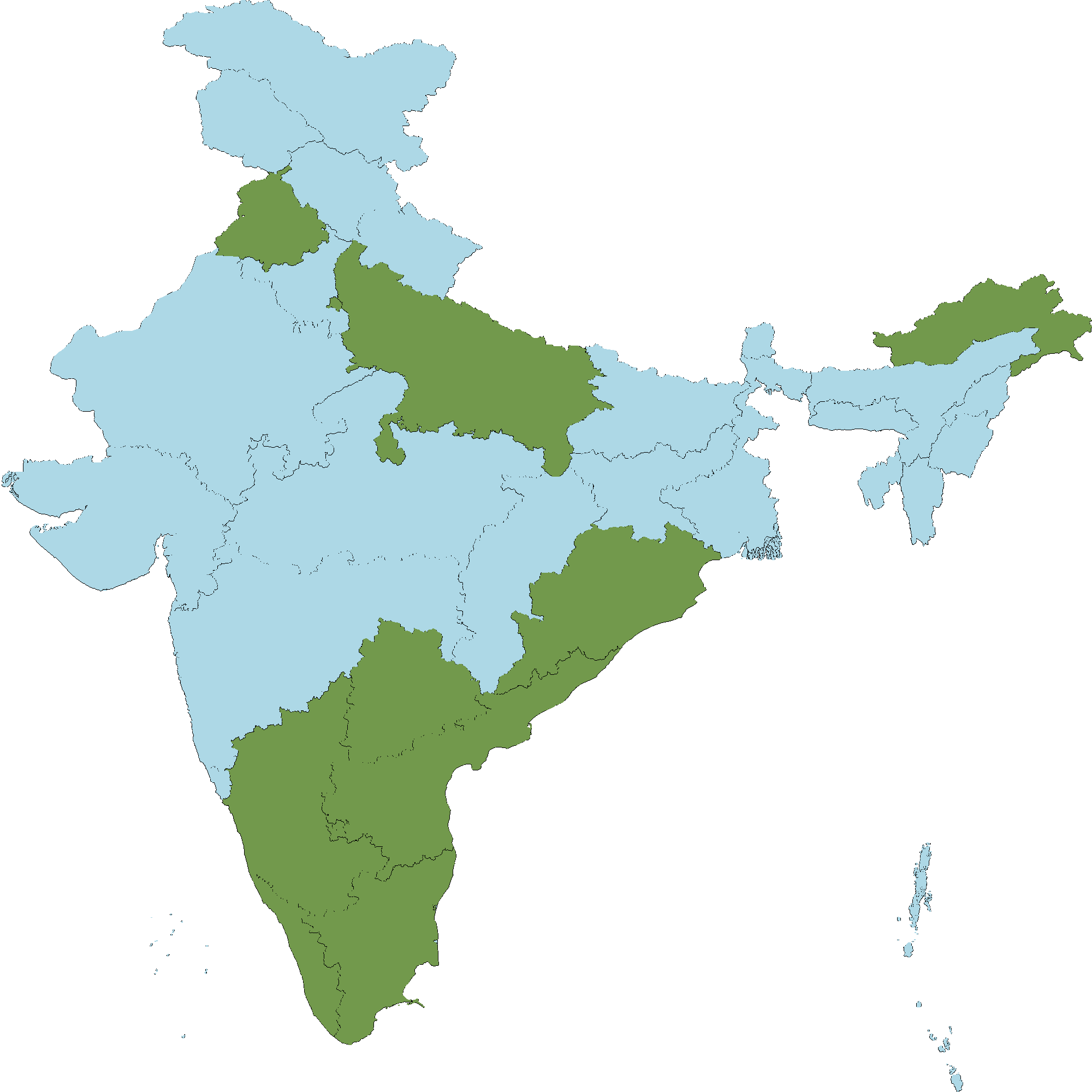 - Andhra Pradesh : Anantapur district, Chittoor district, Kadapa district, East Godavari district, Guntur district, Krishna district, Kurnool district, Nellore district, Prakasam district, Srikakulam district, Vishakapatnam district, Vizianagaram district, West Godavari district