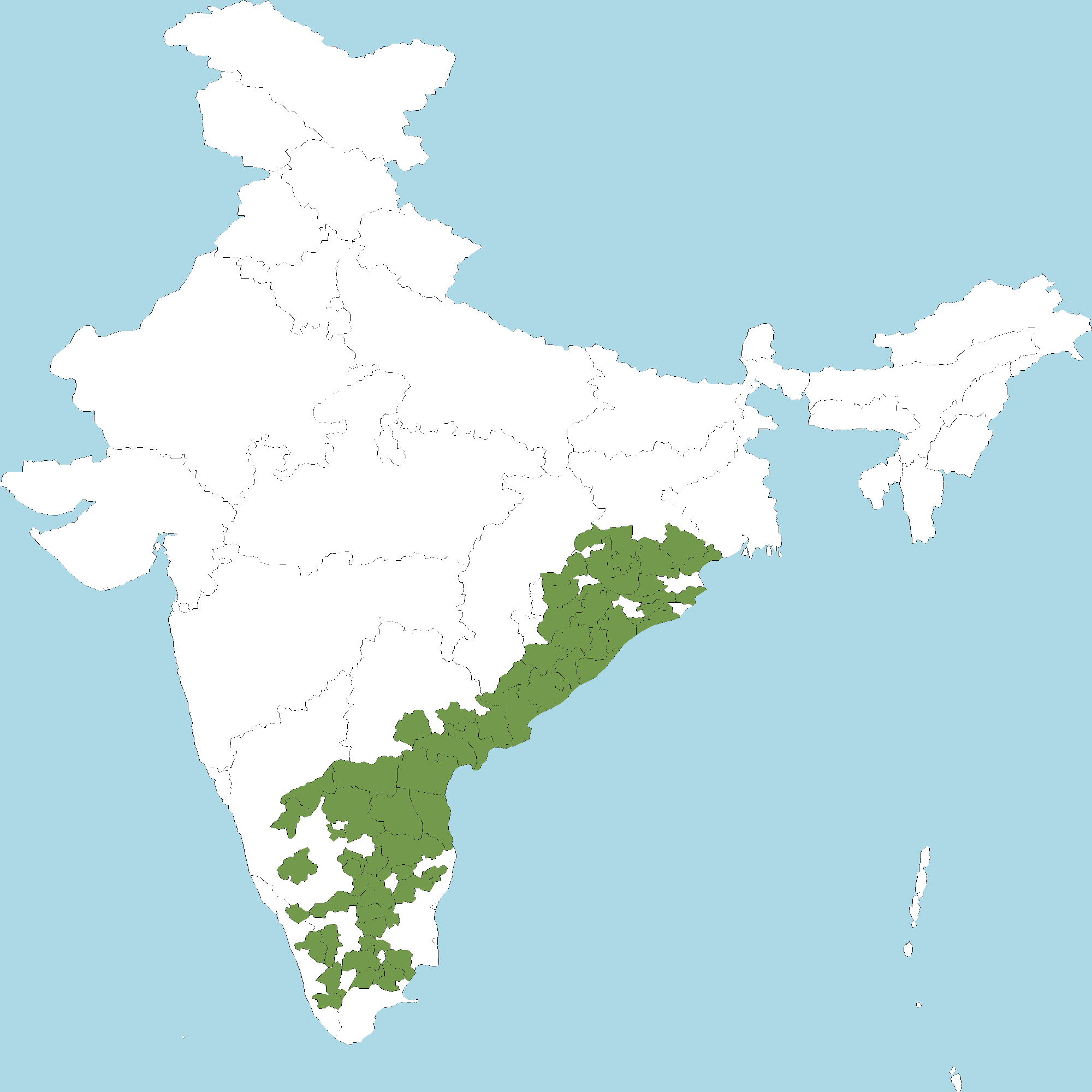 - Andhra Pradesh : Anantapur district, Chittoor district, Y.S.R. Kadapa district, East Godavari district, Guntur district, Krishna district, Kurnool district, S.P.S. Nellore district, Prakasam district, Srikakulam district, Visakhapatnam district, Vizianagaram district, West Godavari district